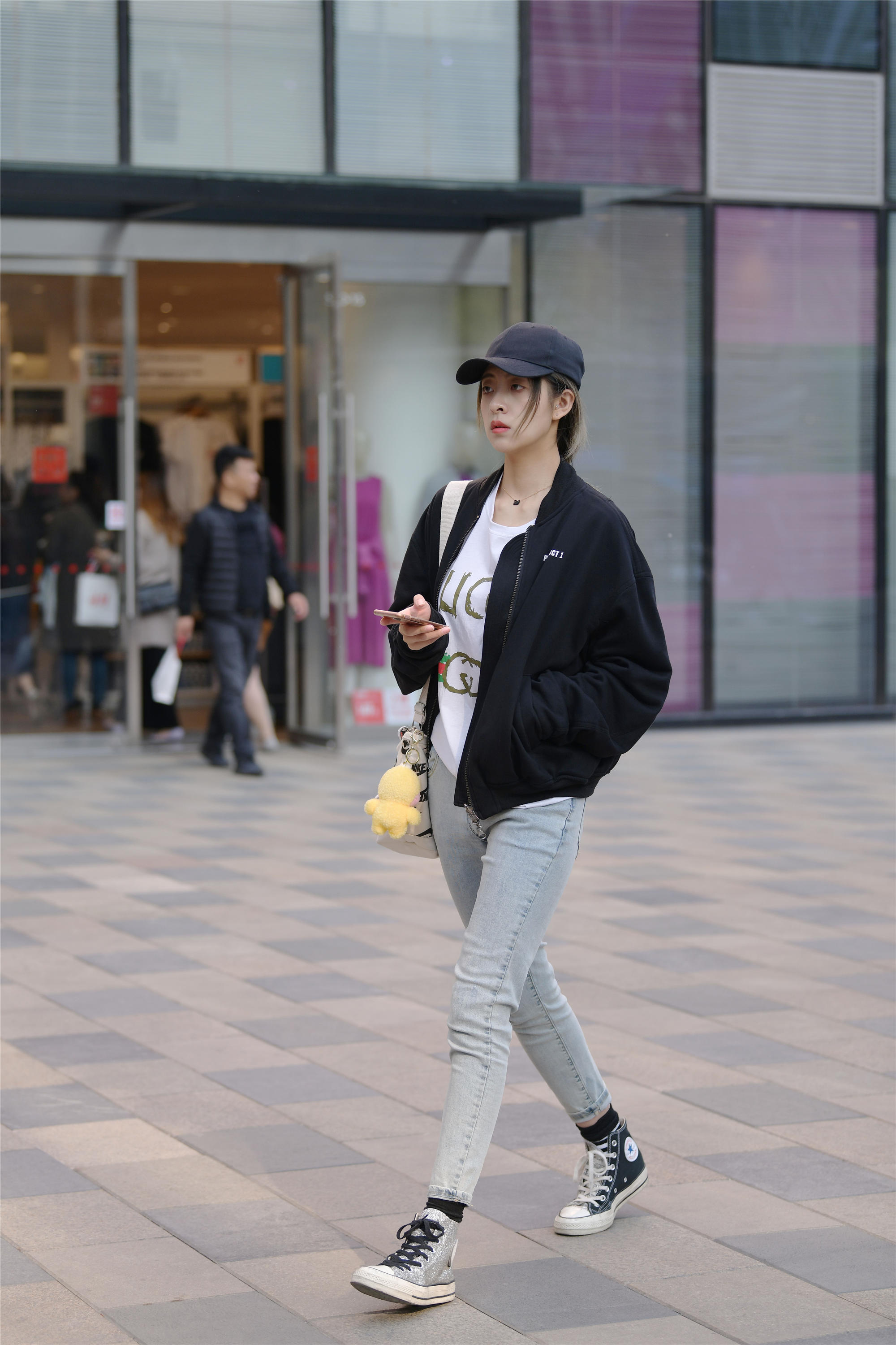 高帮帆布鞋,在春天很多姑娘会穿,这是以前的款式,有着复古的味道,却被姑娘搭配的很时尚,水洗蓝的修身牛仔裤九分长裤的裤脚,还特意挽起一点点,这样会很显得有层次感,一件白色T恤外面是一件黑色夹克,戴着一顶棒球帽,年轻减龄的搭配效果就出来了。