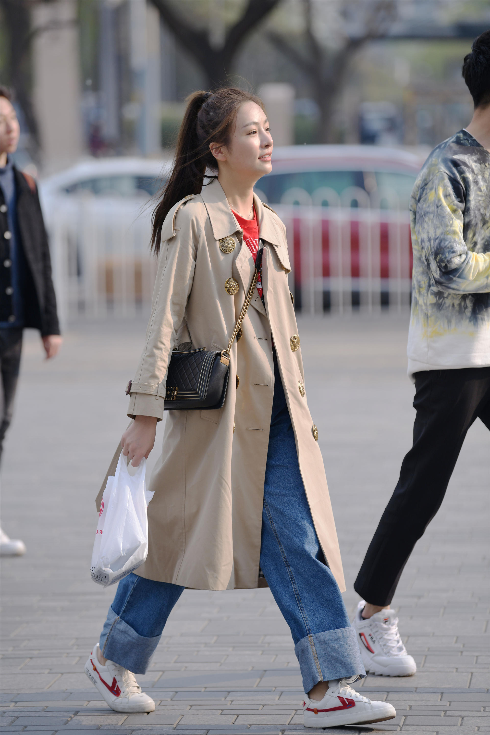 春天,你会选择平底鞋去逛街么?其实轻松舒适的穿搭,想搭配出效果来,却要下一番功夫,看着别人的穿搭很简单,自己搭配一下,却不容易了,看一下这位美女的穿搭,卡其色的长款搭配,显得人很秀气,搭配一条宽松的牛仔裤翻边的裤脚,很高一截,增加色彩的变化,一双白色帆布鞋,很经典的老款鞋子,却一点也不过时,依旧那样好看。
