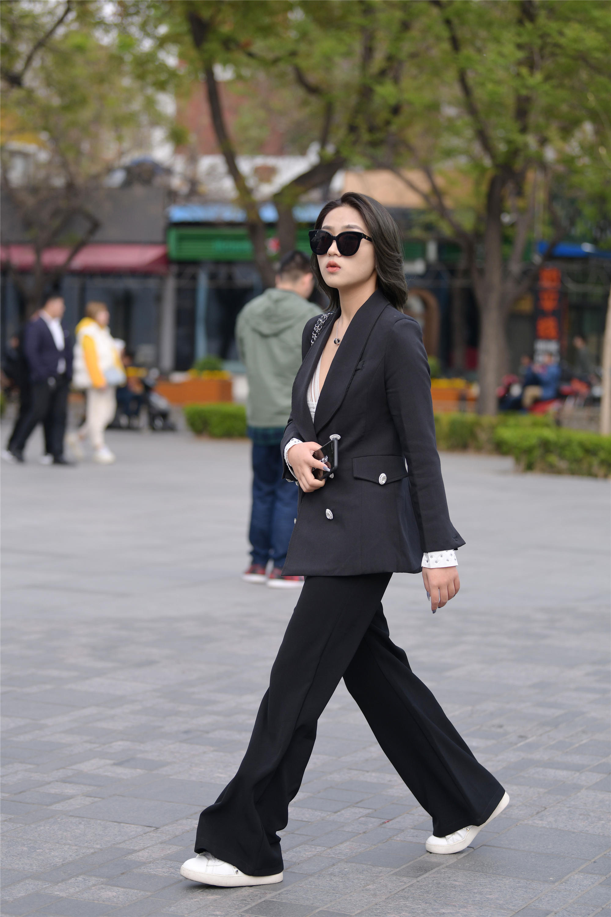 休闲的时候去逛街,是不是可以搭配一套西装呢?看一些这位美女的搭配,黑色的休闲西装,西服的V两设计,非常漂亮,收腰设计也很好看,宽松的西裤,却搭配一双白色平底鞋,这样看起来更像是逛街,其实套餐穿着逛街,也很有意思。