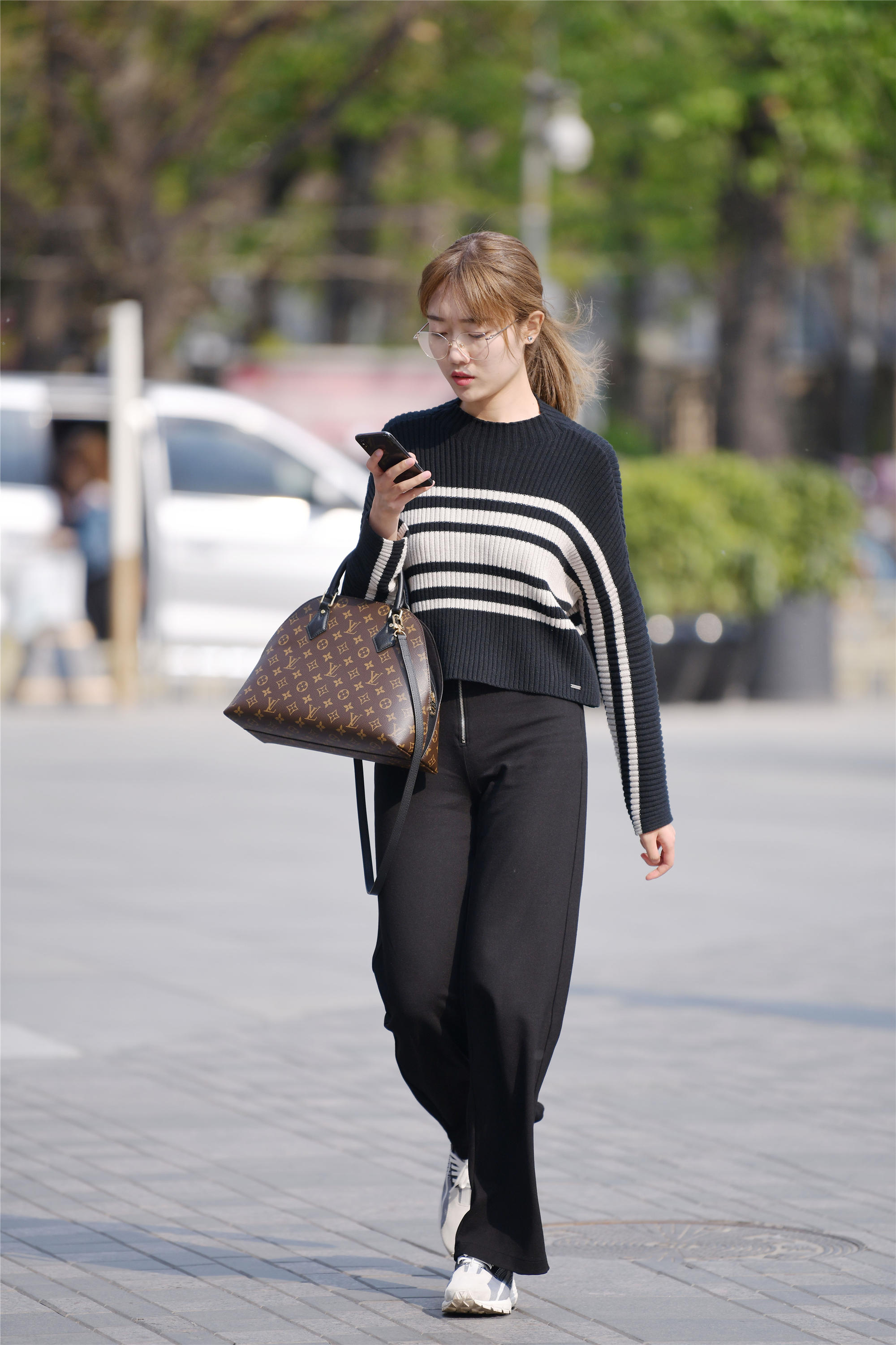 其实每一位时尚姑娘,都在努力的去学习搭配,也期待着自己能够搭配的很时尚,别人用羡慕的眼光去看自己怎么搭配,这位美女的搭配,黑色针织衫,上面白色条纹点缀,贯穿两个袖子,这样的还真不多见,黑色高腰的长裤,宽松的裤脚搭配一双平底鞋运动鞋,休闲的逛街搭配,其实生活中穿平底鞋的姑娘很多,但是要去考虑好搭配,值得你去借鉴的搭配也有很多,多看多学,你也会把逛街的穿着,搭配的很时尚。