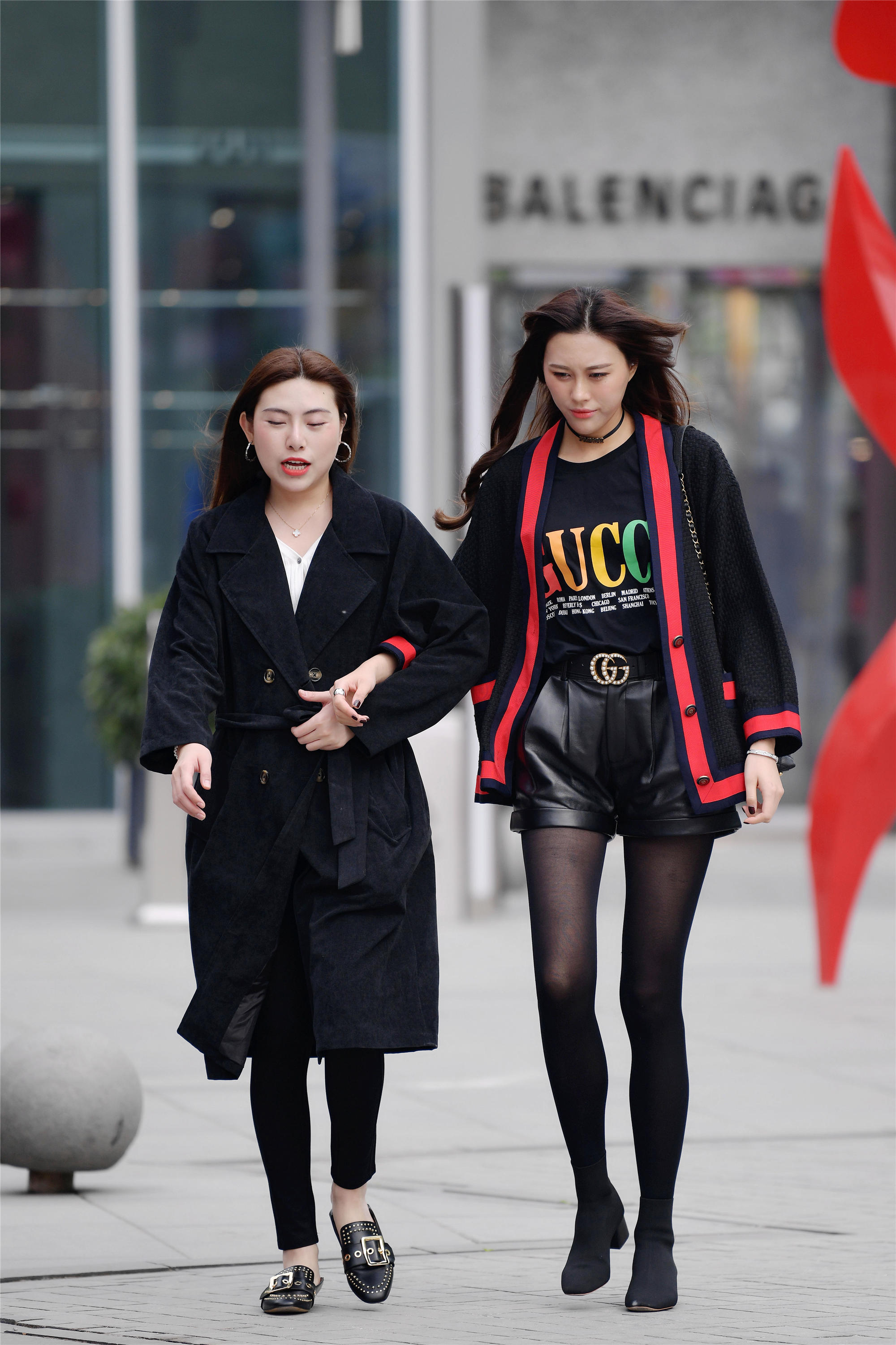 很多人在逛街会约上自己的闺蜜,对于时尚的姑娘来说,逛街要搭配一下的,穿出自己的时尚品味,有身材的姑娘,会选择显身材的穿搭,看一下这对闺蜜,身材高挑的姑娘,高腰的皮质短裤,显得身材比例很好,黑色丝袜,修身又显腿长,穿着一双短款的袜靴,黑色T恤外面穿着一件针织夹克,红色镶边非常漂亮,增加色彩,她的闺蜜时一件黑色大衣搭配黑色修身九分裤,一双金属钉元素的平底鞋,非常有质感。