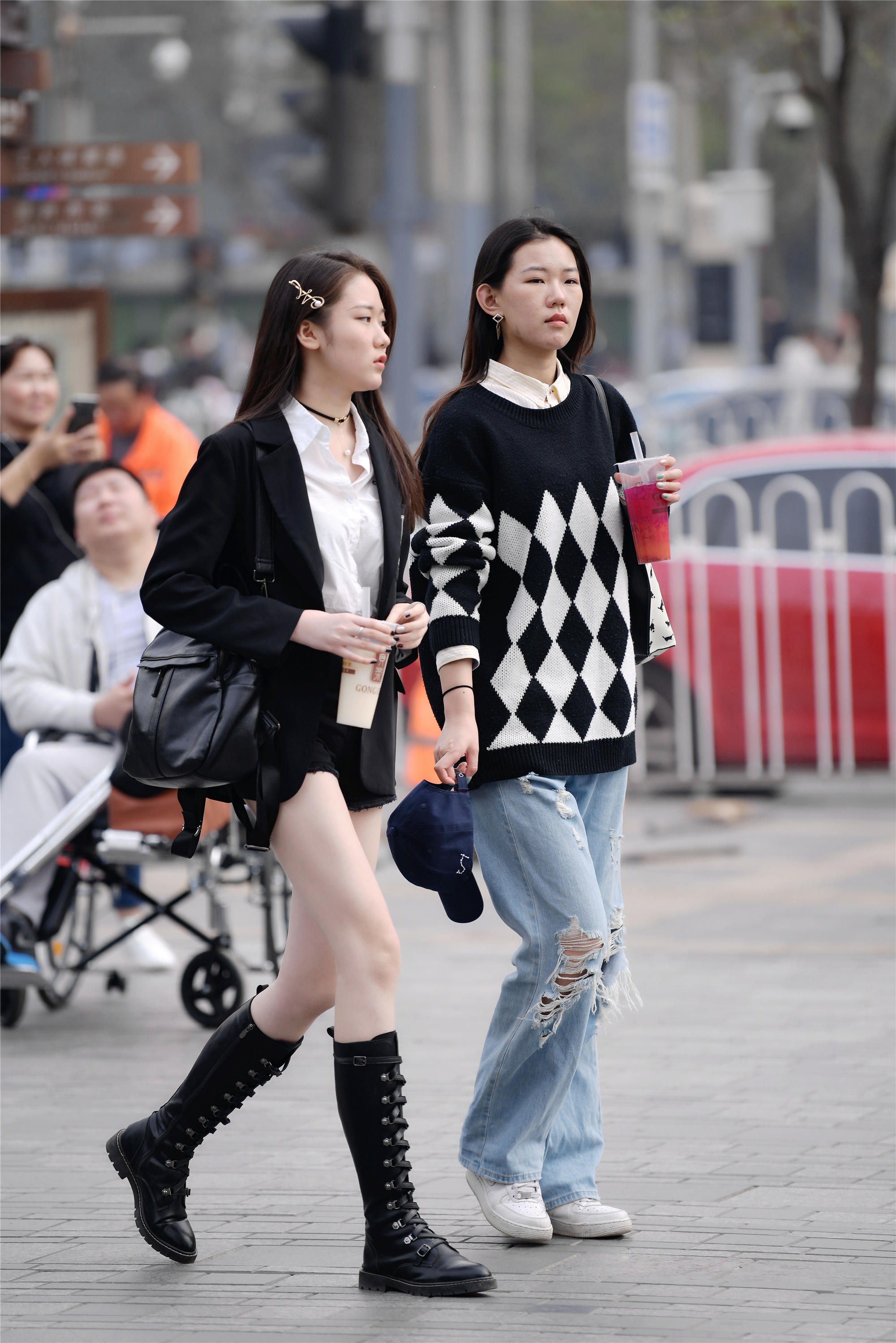 北京的春天很美,来的也很快,就看那树叶,一夜之间,就有了绿意,随着温度的升高,很多时尚姑娘都出来逛街,约上自己的闺蜜,到时尚街区转一下,感受一下春天,感受一下时尚气息,这一对闺蜜也时很会搭配的,穿出两种风格,黑色西服搭配白色衬衫,毛边的牛仔短裤,一双马丁长靴,年轻又显得正式,她的闺蜜时一身休闲的穿搭,针织衫上的被白色菱形格子,非常漂亮,破洞的宽松牛仔裤搭配一双平底鞋,很放松休闲着装。