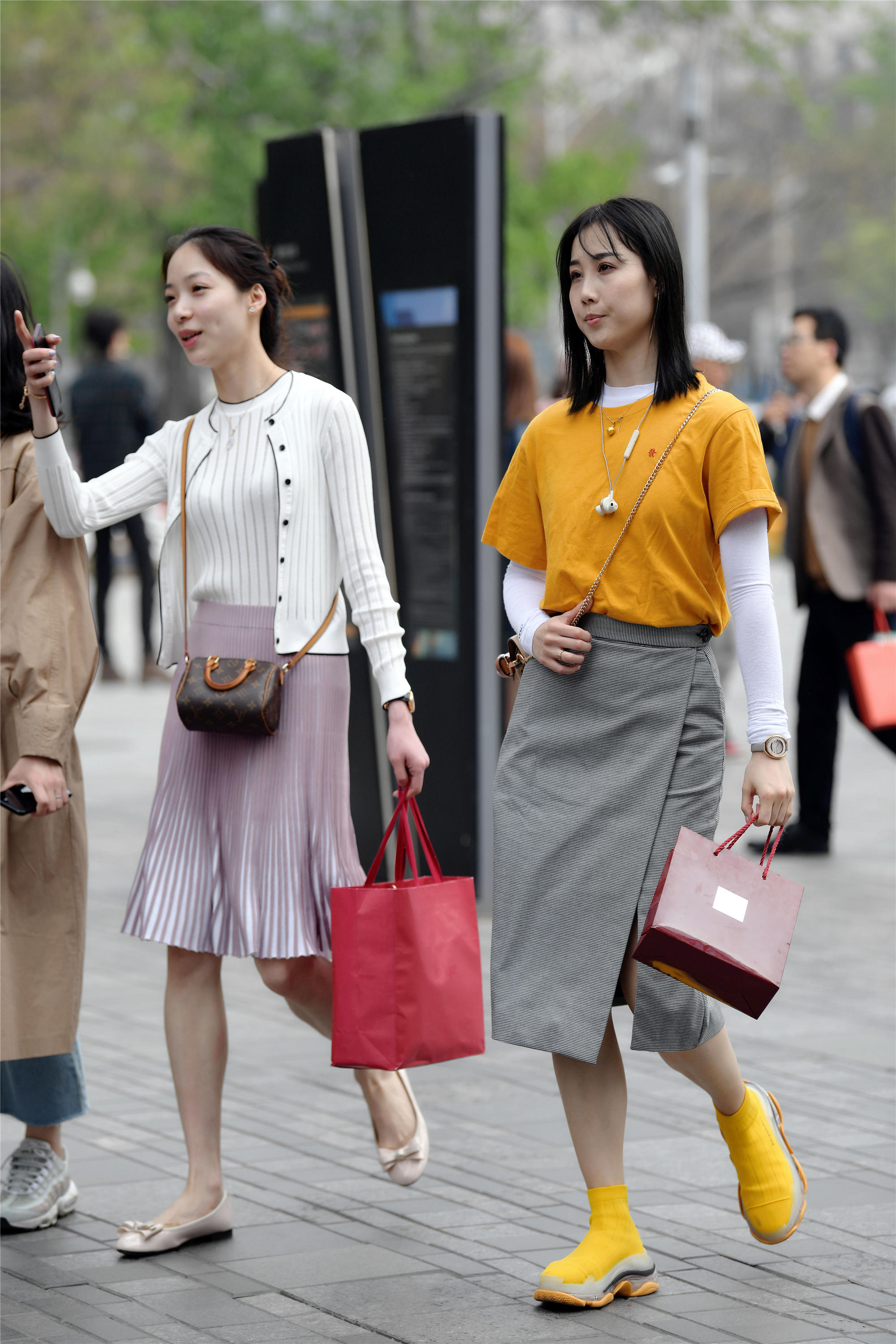 春天和闺蜜出行,商量一下怎么搭配,可以更好的展现自己,这一对闺蜜,她们都是穿着半身长裙,一位是藕粉色的压褶长裙,搭配白色针织衫和针织外套,显得很清爽,一双平底瓢鞋,逛街会更加轻松,她的闺蜜穿着一件灰色斜纹的高腰筒裙,显得身材比例很好,黄色半袖里面还有一件白色圆领长袖,这样穿搭很有意思,一双黄色运动袜靴,和半袖色彩相呼应。