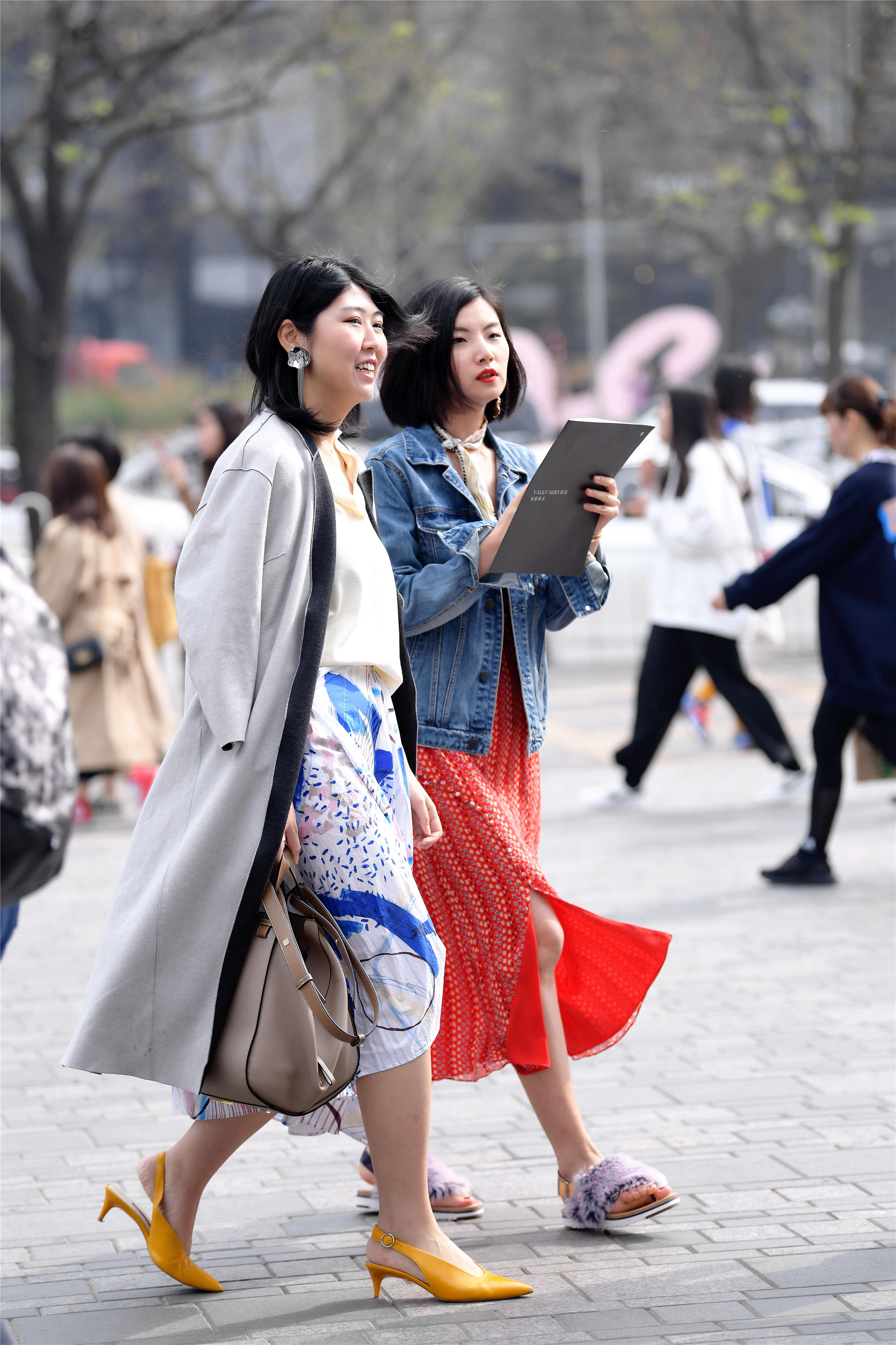 春天和闺蜜可以相约穿着裙子,要选择有色彩一点的,这样才符合春天的时节,一位穿着白色底,蓝色图案点缀的半身长裙,高腰的效果显得身材比例很好,搭配一件米色小衫,披着一件灰色的风衣,非常又个性,一双黄色尖头细跟凉鞋,她的闺蜜时一件红色连衣裙,穿着一件牛仔夹克,有点混搭风的感觉,脚下的凉鞋时毛绒绒的,春天这样穿,觉得也不错。