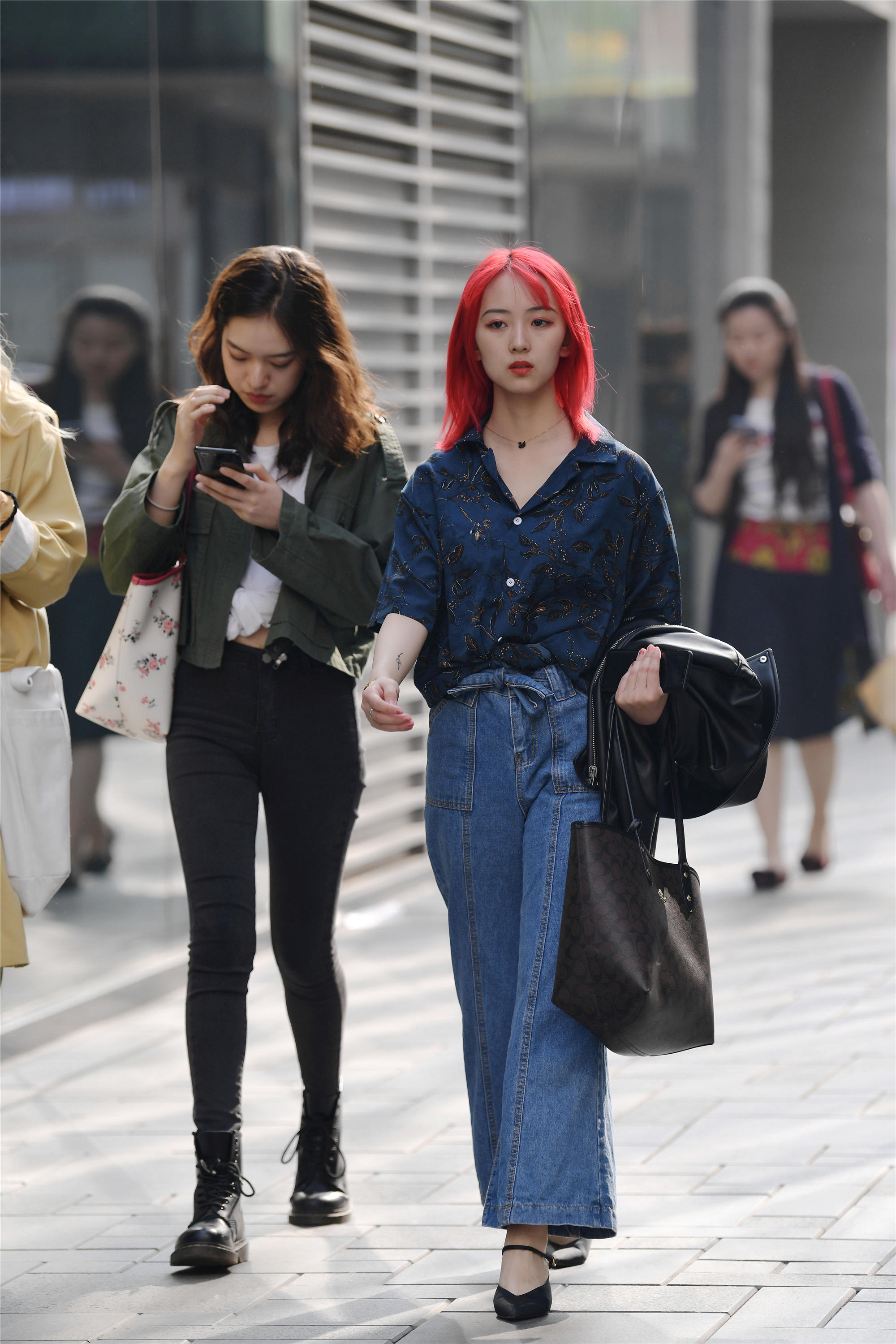 如果是和闺蜜穿着牛仔裤去逛街,你会怎么选,要一样的风格,还是搭配出不同的款式,先看一下这对闺蜜的穿搭,一位时高腰的直筒牛仔裤,搭配一件蓝色印花衬衫,穿着一双尖头皮鞋,一件皮夹克搭在臂弯里面,粉红色的秀发显得人更加精致,她的闺蜜时一件黑色修身牛仔裤,一双马丁短靴,有着工装鞋的效果,白色衬衣搭配一件绿色夹克,很秀气的感觉。