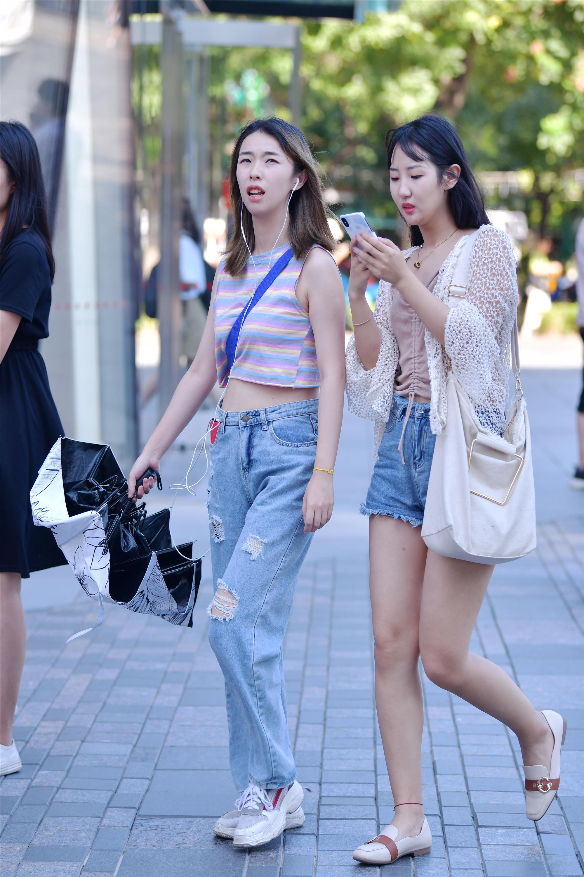 初秋时节,有了秋高气爽的味道,非常适合逛街,在时尚街区,三三两两的行人很多,约着闺蜜好友,一起出来逛街,享受逛街的乐趣,要怎么搭配自己呢?看一下这一对闺蜜,她们选择相同的牛仔元素,一位选择破洞牛仔长裤搭配小背心,一位选择毛边牛仔短裤搭配抽绳上衣,外面罩着一件镂空的小开衫,搭配都很简约,却非常有层次感。