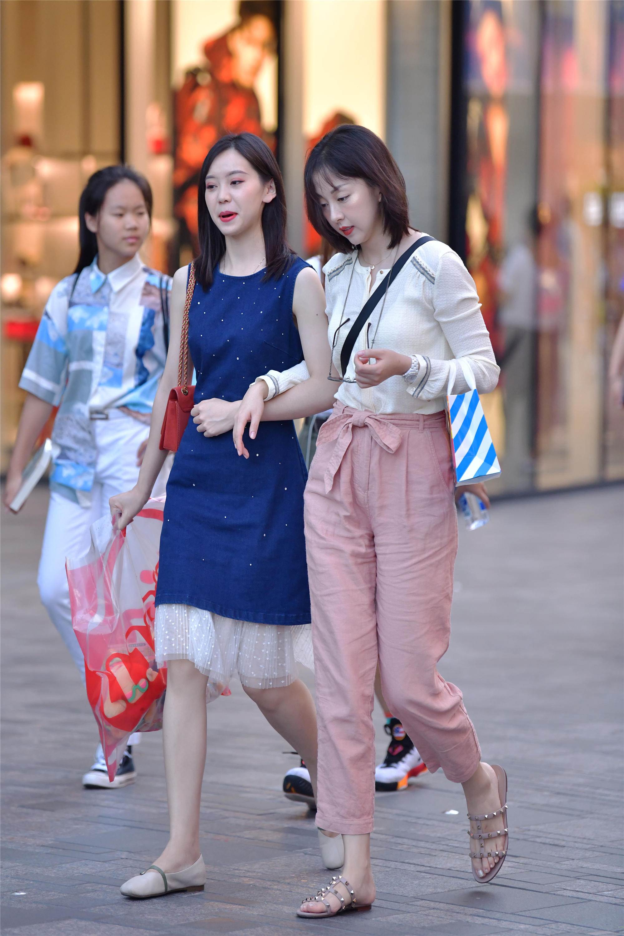 和闺蜜逛街,要搭配出一点不一样的味道,才会各自展现自己,现在流行的是差异化,要搭配出自己的味道,而不是流行什么,大家都穿着,如果时尚街区,大家都穿着一样的衣服,那就热闹了,这一对闺蜜一位选择粉色的九分高腰裤,搭配白衬衣,简单又好看,还显身材比例,她的闺蜜是一件蓝色的连衣裙,裙摆处露出一点白色蕾丝,非常简约的搭配效果。