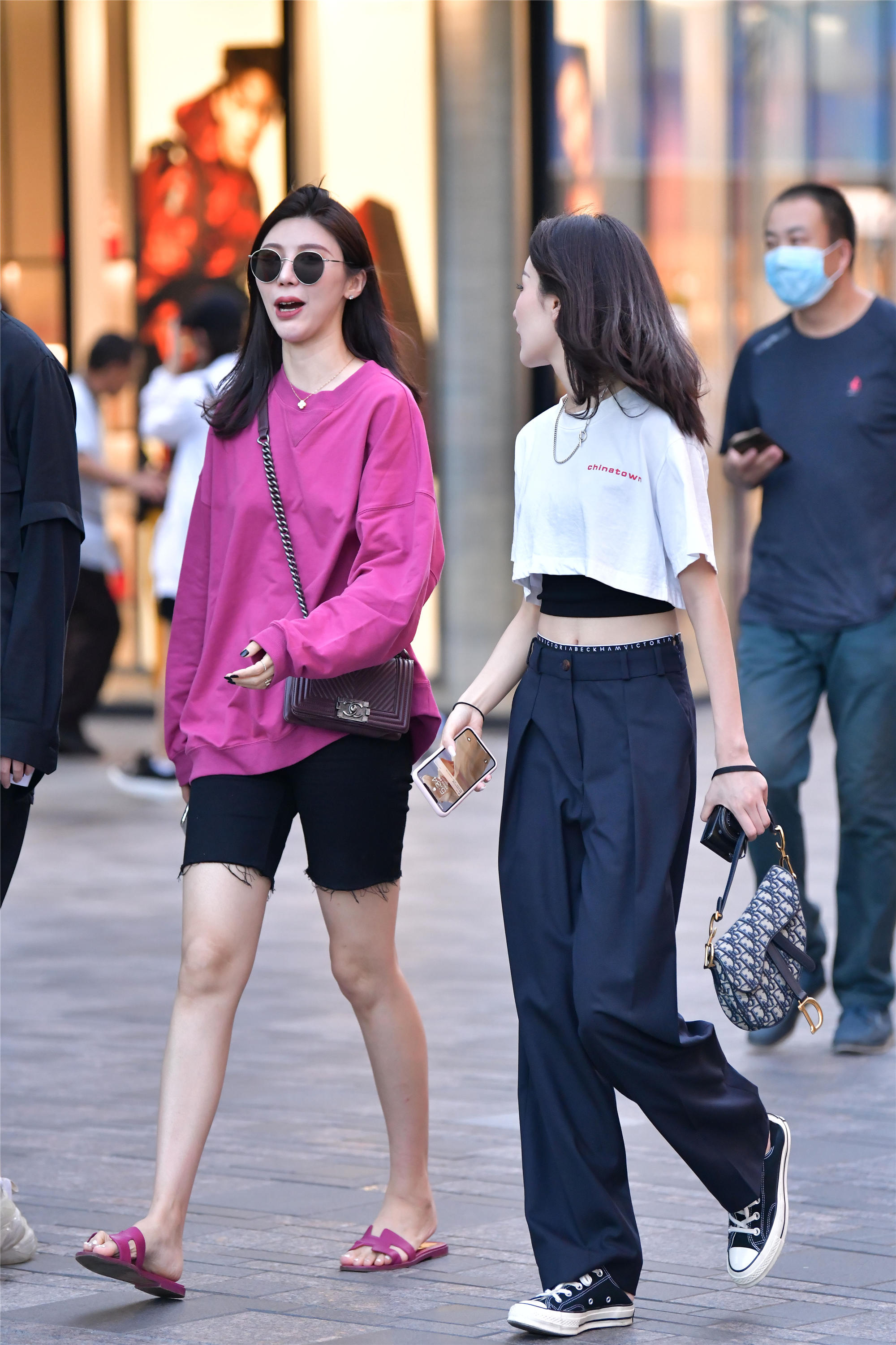 对于喜欢穿搭的姑娘来说,她们更加自信,因为服装选择的原因,她们知道自己会更受欢迎,她们也愿意把自己搭配得很美,这一对姐妹,搭配不同,一位选择重要长裤,深蓝色的款式,搭配平底帆布鞋,有着小女生的效果,一件白色短款半袖,非出简约,也显身材,露出一点腹部,她的姐妹是一件紫色的卫衣搭配一条5粉牛仔裤,如果卫衣的一侧衣襟掖在短裤里,会更有意思。