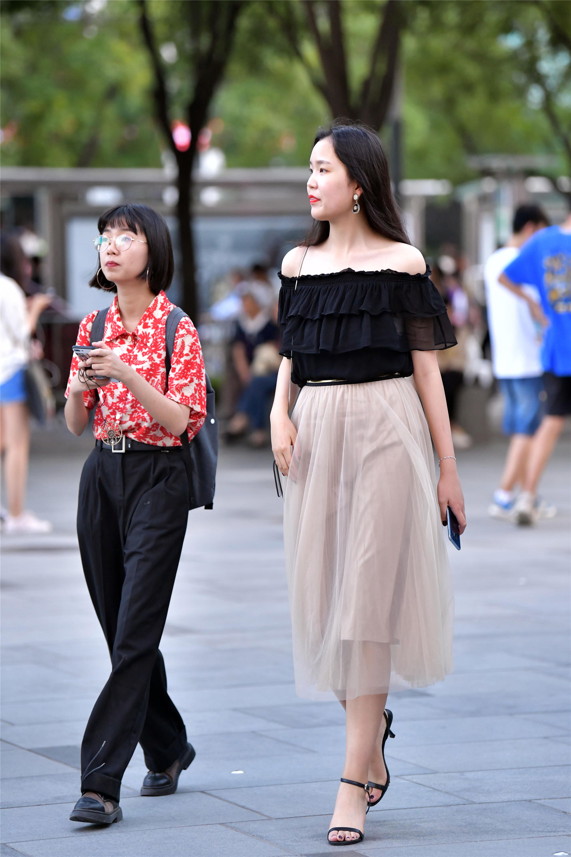 时尚搭配,就是遮挡自己的缺点,展现自己的有点,把自己最美的一面展示出来,很少有完美的女人,所以很多人喜欢搭配,喜欢化妆,看一下这一对闺蜜,身材高挑的搭配黑色一字肩,和一条米色的高腰长裙,搭配出很显身材比例效果,脚下还穿着一字带细跟凉鞋,她的闺蜜身材没有这么高,却用深色长裤和红白色的印花半袖,搭配出很显身材比例效果,穿出了自己的风格出来。