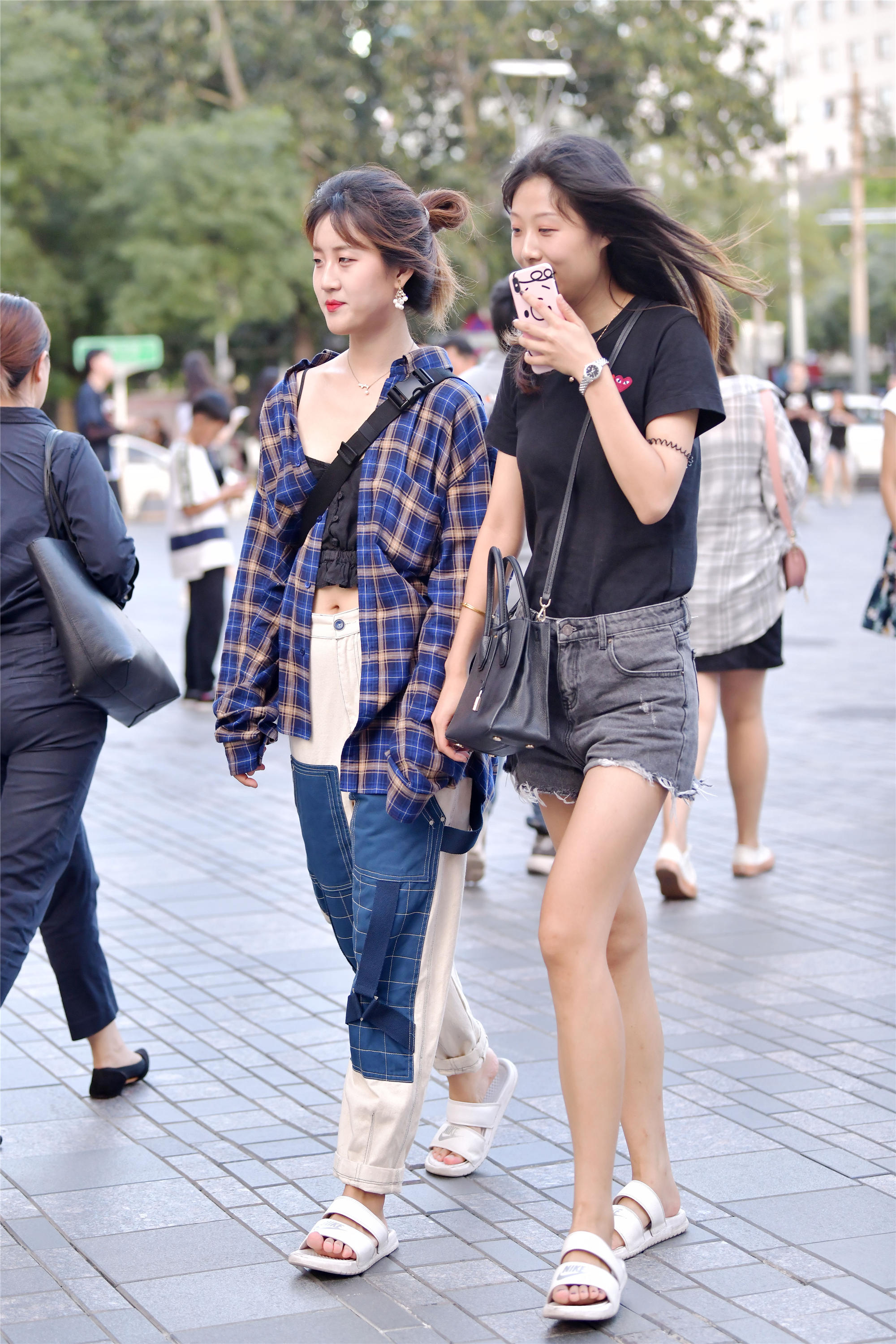 穿衣风格,不同的人,会搭配出不一样的味道来,看一下这一对闺蜜的搭配,一位是低腰牛仔短裤,毛边的款式,突出自己的个性,黑色的半袖,非常简单的搭配,脚下一双凉拖,她的闺蜜是一件拼接长裤,很个性的裤子,搭配一件吊带外面一件是蓝色格子衬衫,非常休闲又显年轻的搭配,和她的闺蜜选择同款的凉拖出行。