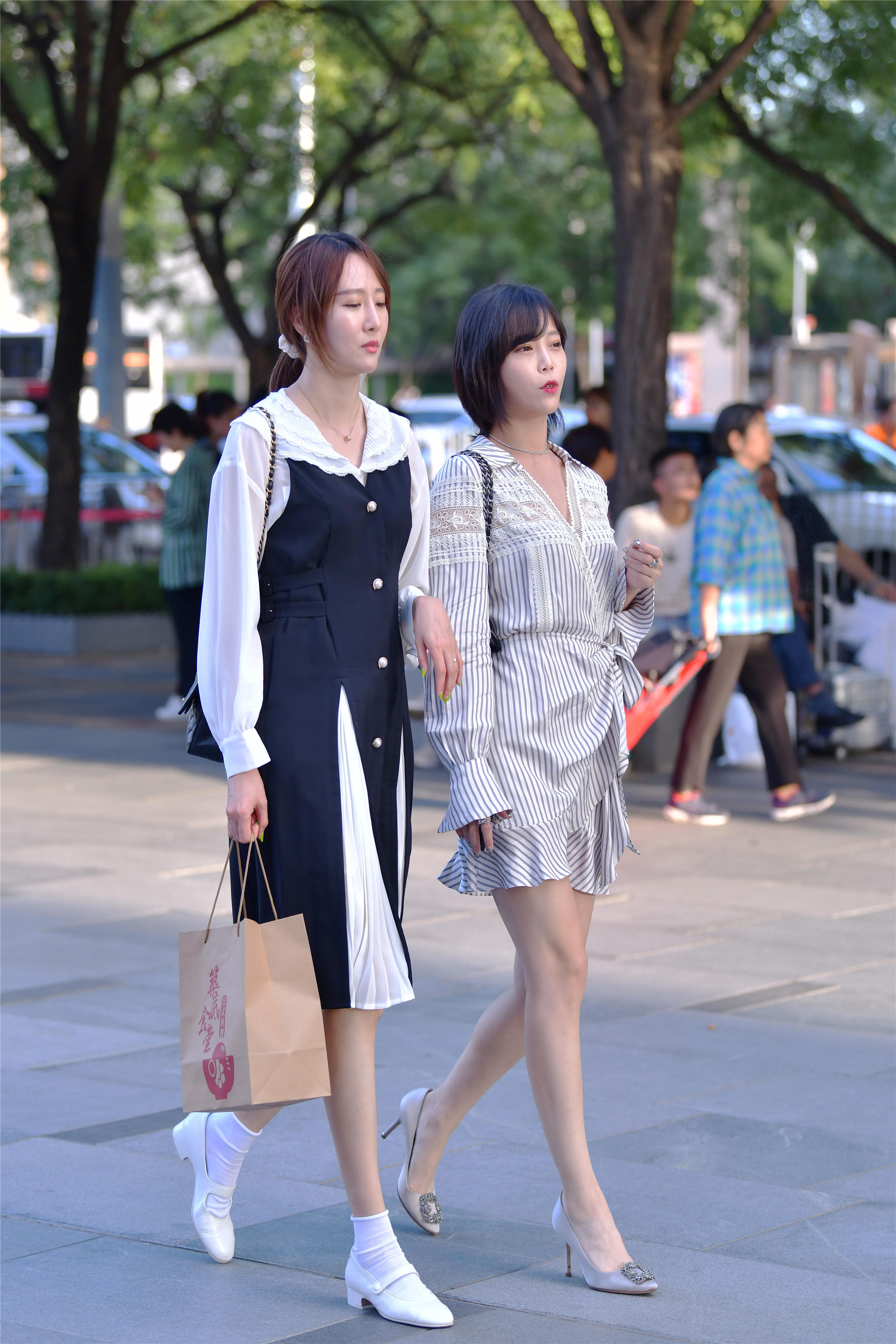 初秋时节,要搭配出自己的味道,约上自己的闺蜜,到时尚街区走一走,逛街吃饭,享受这放松的过程,看一下这一对闺蜜,一位穿着深蓝色与白色相结合的连衣裙,非出简约,更像是拼接在一起的,搭配出很精致的效果,脚下白色短袜和白色皮鞋,穿出很个性的效果,她的闺蜜是一件竖条格的连衣短裙,黑白的竖条格,组合出浅色系的效果,搭配一双尖头细高跟单鞋,很好的衬托她的身材,鞋尖的方扣设计,也非常票,增加层次感。