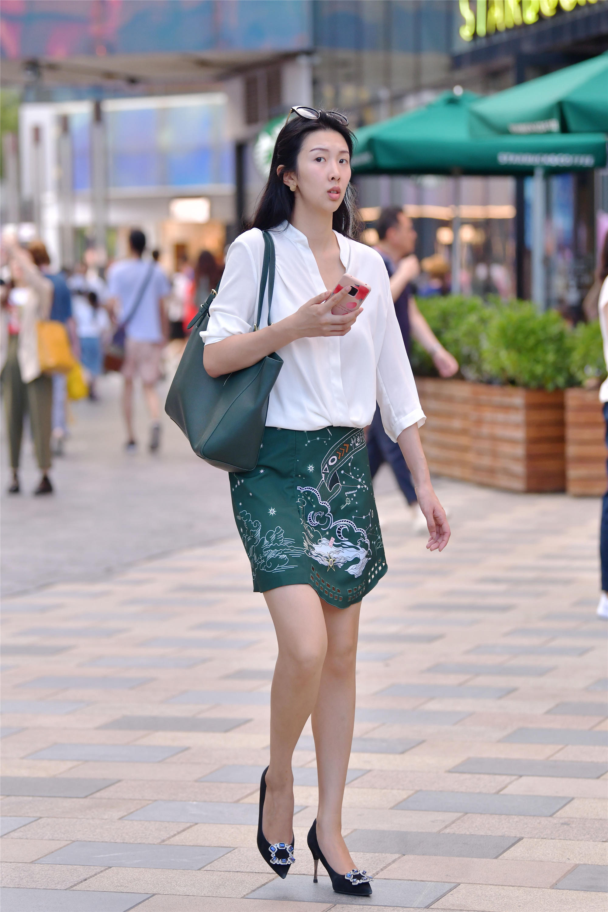 半身裙有很多漂亮的款式,也会搭配出很个性的效果,看一下这位美女的穿搭,绿色的短裙,上面的白色花纹,不规则的裙摆,会让你觉得非常有个性,一件白色衬衣,袖子是中长款的,搭配很简单,脚下一双黑色尖头细高跟单鞋,鞋尖的方扣上镶嵌着宝石,非常好看,也展示精致的效果来。