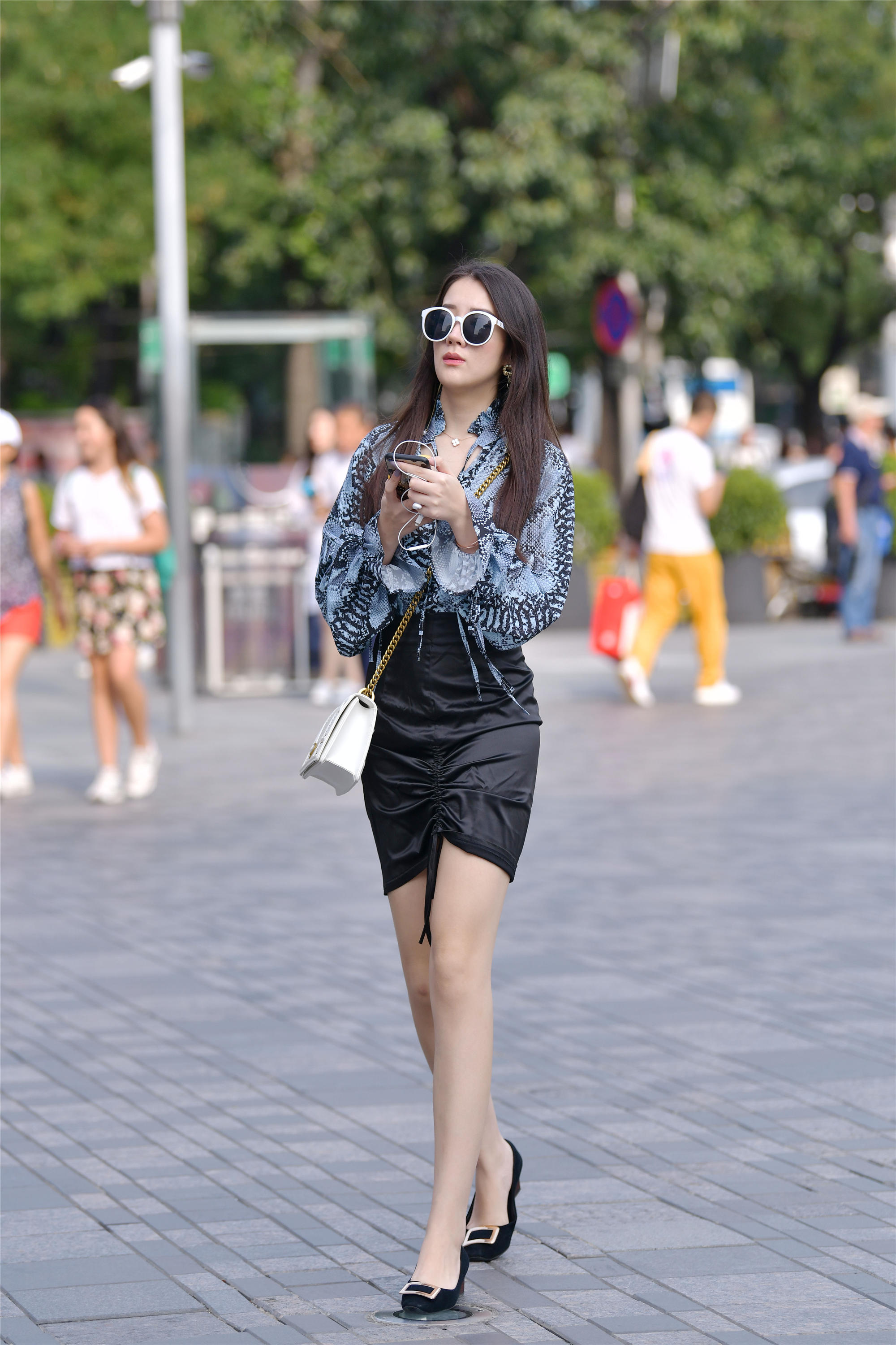 很多人喜欢初秋时节,可以任意搭配,又不会太热,所以这个时节出门的人很多,时尚街区也非常热闹,看一下这位时尚的姑娘,一件黑色高腰筒裙,穿出身材效果,后面的开叉,增加设计感,走路也会很轻松,一件白色的大领口小衫,米白色款式,上面有黑色大斑点,简约个性,脚下穿着一双平底鞋,要是换成高跟鞋,身材会更好看。