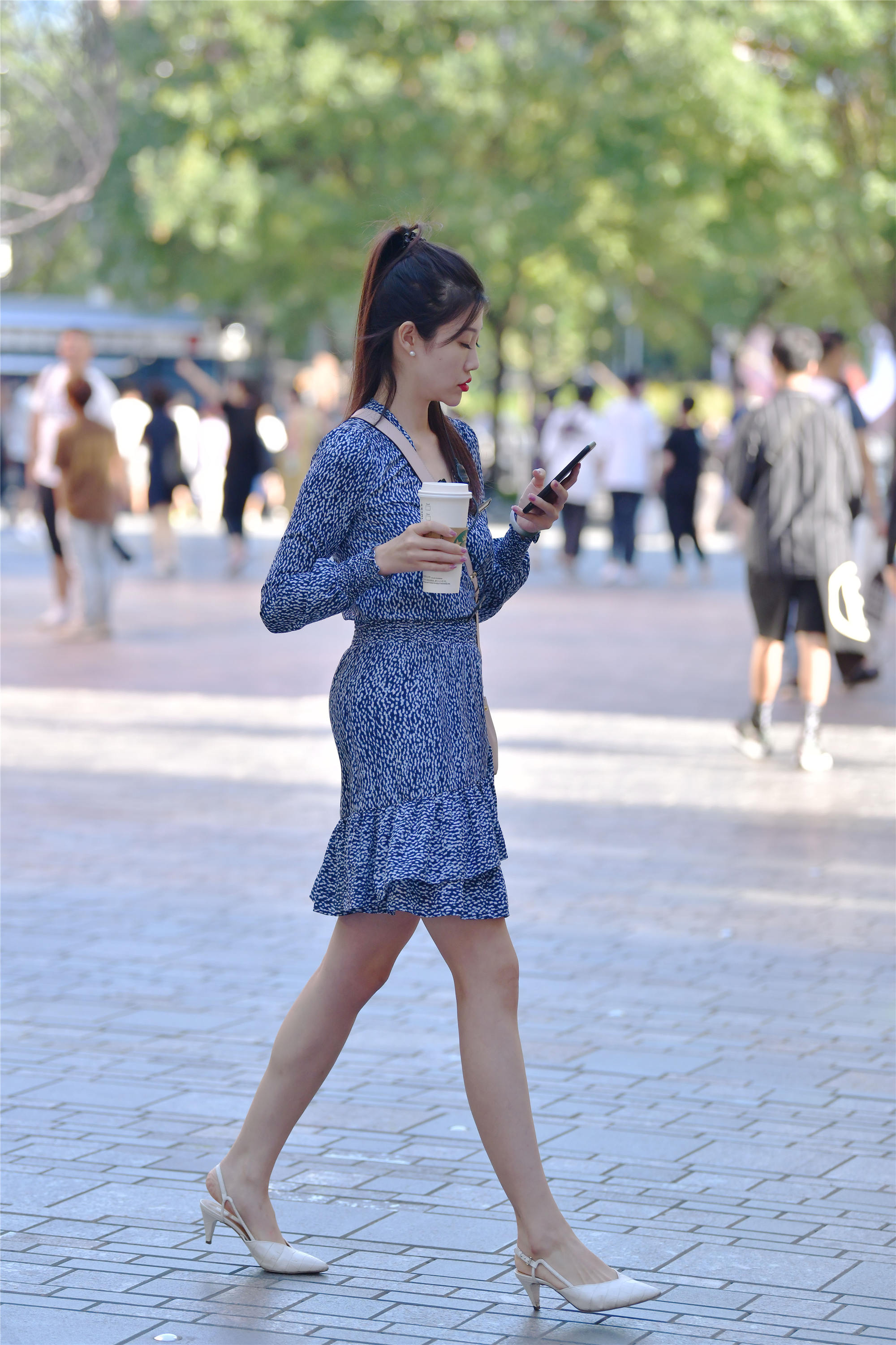 很多时尚的姑娘,喜欢穿着高跟鞋,而且很多人都会有高跟鞋,时不时的会穿着高跟鞋出去走一下,很多职场女士也穿着高跟鞋,看一下这位美女,连衣裙搭配高跟鞋,很经典的搭配组合,蓝色与白色组成的雪花效果的连衣裙,很个性,收腰的设计很好看,也显出身材比例,米白色的尖头鞋,鞋跟不高,3厘米左右,逛街会非常舒适,这样搭配简单易学。