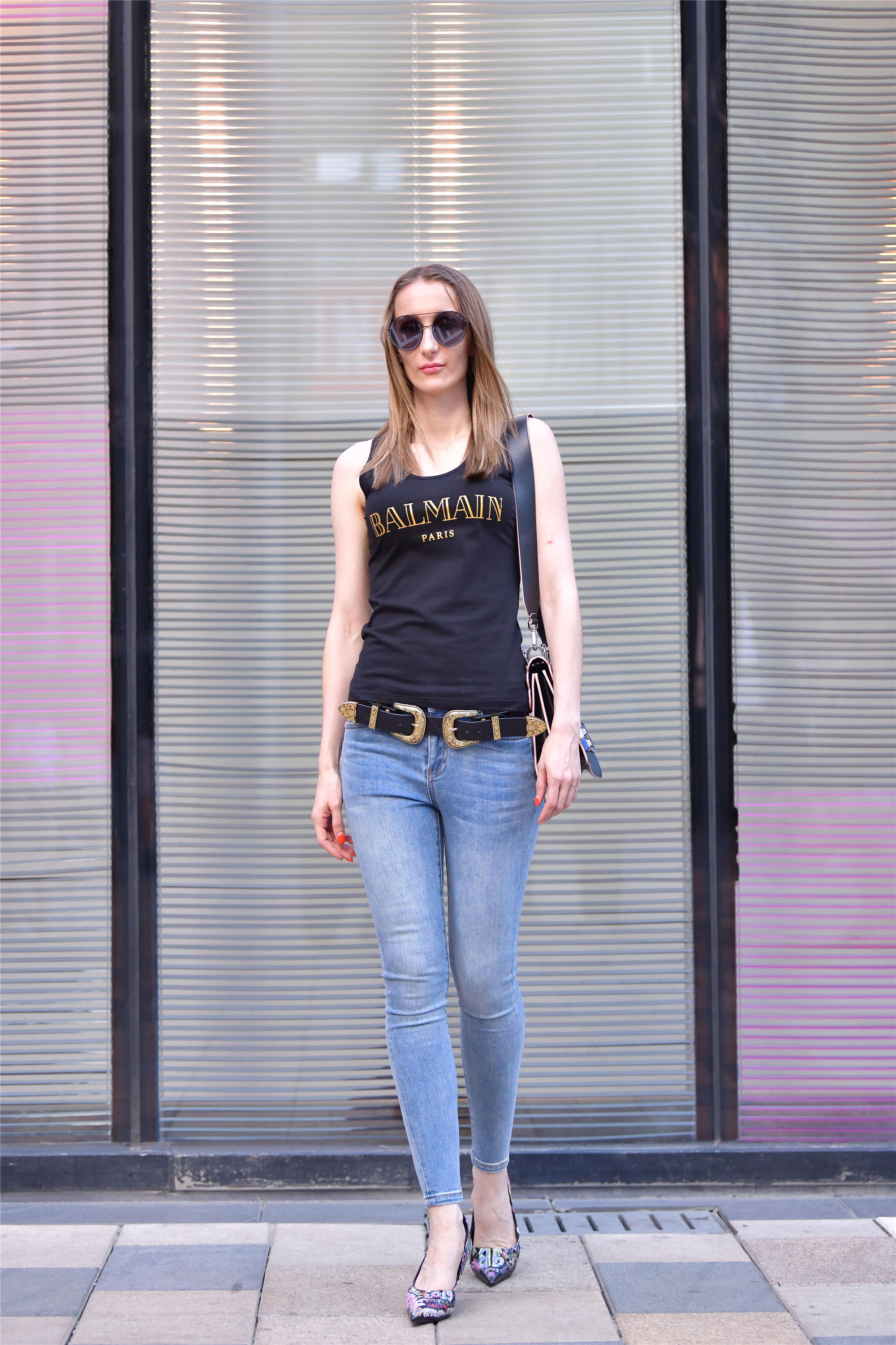 初秋时节,修身牛仔裤也会搭配出很不错的效果来,适应季节,也搭配出很漂亮的感觉,这位美女选择一款浅蓝色的低腰修身牛仔裤,搭配一条黑色宽皮的腰带,金色的金属扣装饰,非常漂亮,增加质感,搭配一件无袖的黑色背心,如果将背心的衣襟挽起一点,会更加突出身材,脚下一双有点涂鸦效果的尖头细高跟单鞋,更好的衬托这款修身牛仔效果。