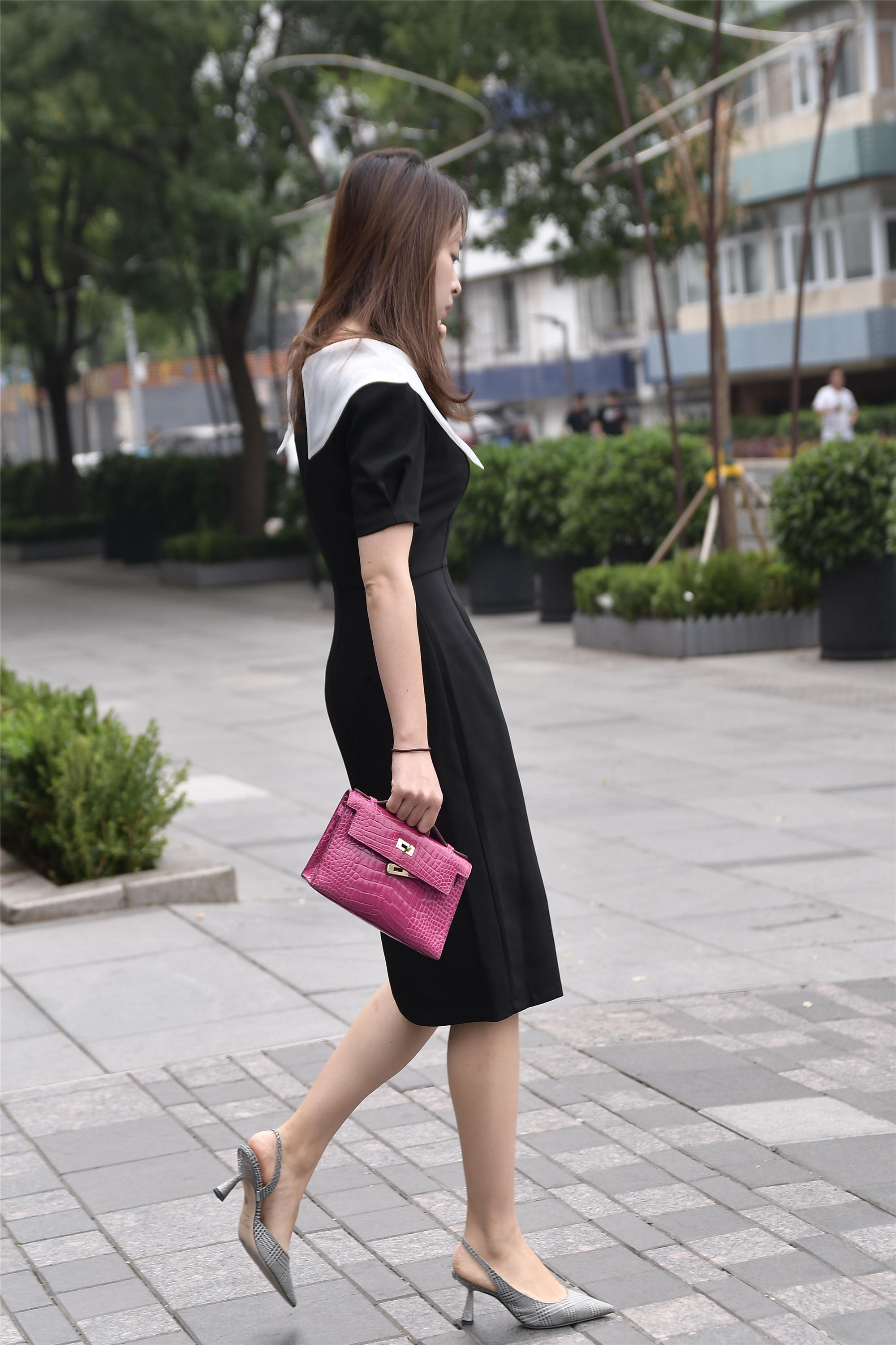有了高跟鞋,会有更多的时尚漂亮的姑娘愿意搭配出门,到时尚街区展现身材,每一位爱美的姑娘,在出门前都会看着自己的衣橱,选来选去,简单的搭配,会有着很好的效果,这位美女选择一款黑色连衣裙,收腰的设计很美,显出细腰,白色的领子,增加色彩对比,脚下一双灰色的尖头细跟鞋,非常简约的款式,鞋跟也不高,穿着逛街很舒适,也衬托身材。