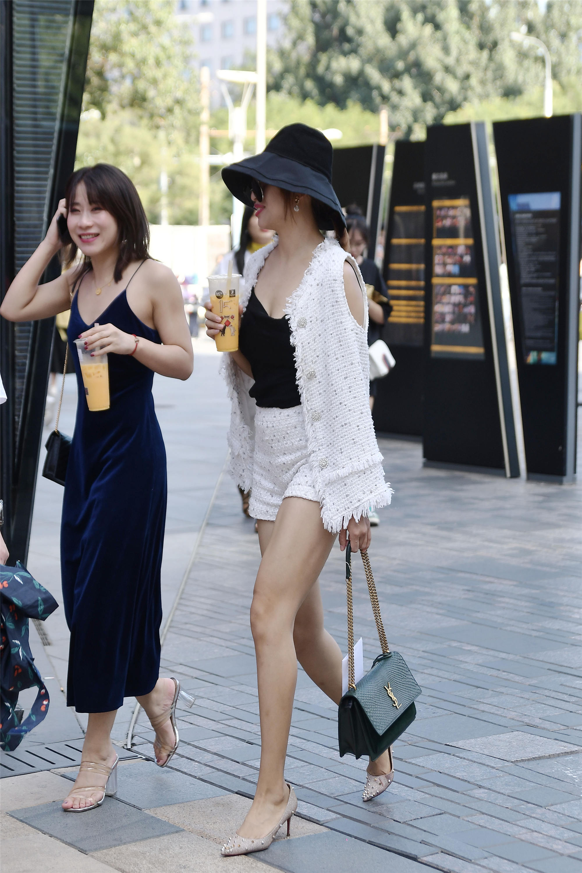 时尚的姑娘喜欢穿高跟鞋,特别是到时尚街区,要穿得很精致,搭配一双高跟鞋,更是起到锦上添花的效果,也提升一个人的气质,这位美女的选择,黑白色为主,白色短裤搭配黑色吊带,外面披着一件无袖粗呢针织小衫,一顶黑色的渔夫帽,非常简约的搭配,脚下一双灰额尖头细跟单鞋,鞋面上的金属铆钉,非常个性,展现出不一样的味道,搭配出很美的效果来,鞋跟虽然不高,却很好地展现了她的气质。