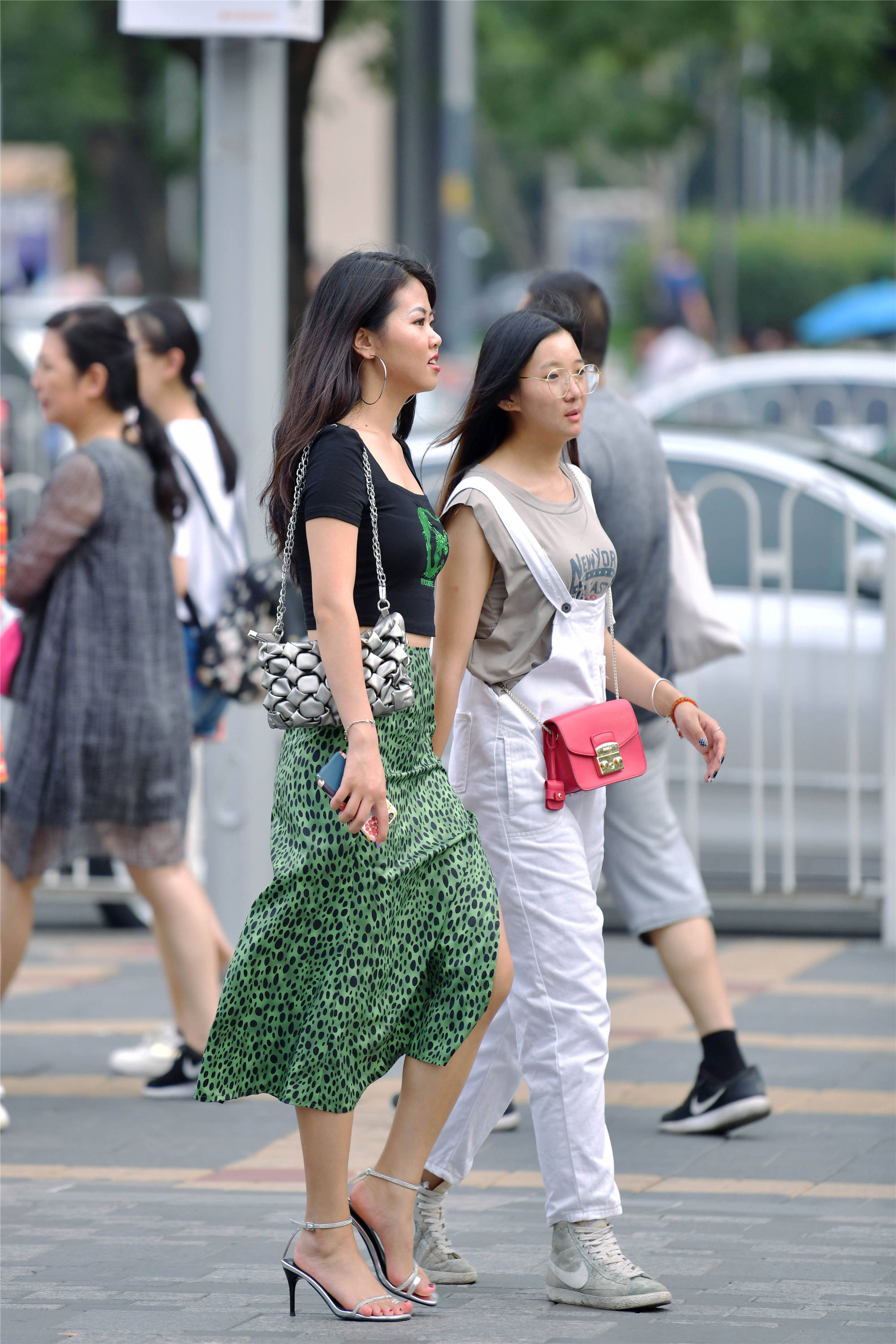 很多时尚的姑娘,都很会搭配,特别是和闺蜜一起,要把自己搭配得很美才好,这位美女选择豹纹裙,绿色的款式,黑色点分布在上面,非常漂亮的效果,搭配一件黑色小半袖,脚下一双一字扣细高跟凉鞋,这样搭配出身材比例很好,也展现出自己的时尚效果,搭配出很自信的效果,她的闺蜜是一件白色吊打牛仔装搭配一件浅灰色的小衫,非常悠闲的穿搭,也展现身材比例感觉。