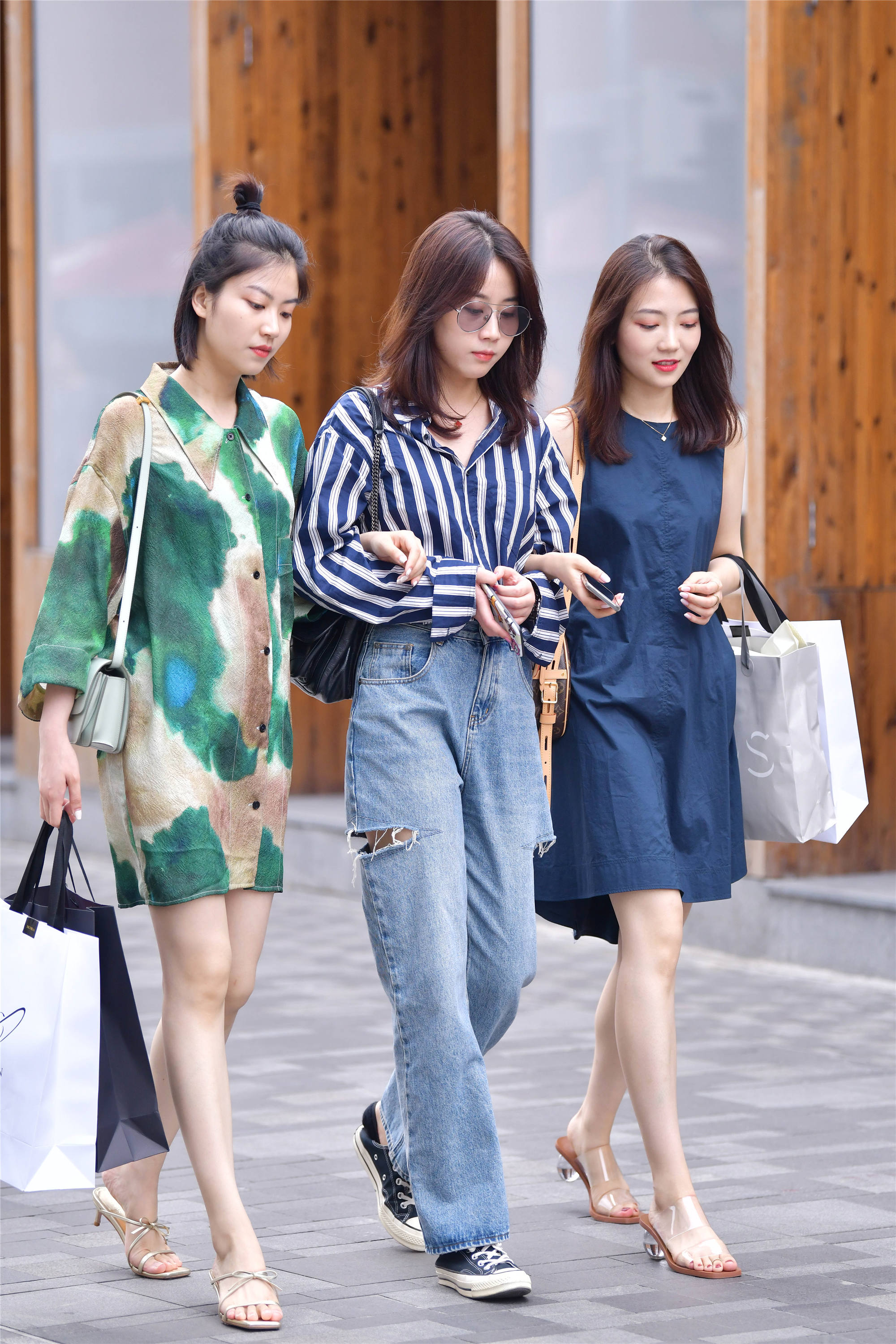 很多人都是约着一位闺蜜一起,但是三个人一起逛街,就会更加热闹,像是一台戏一样,这三位闺蜜一起,每个人的搭配丢不一样,穿出自己的感觉,一件长袖外套搭配凉鞋,非常简单的穿搭,一位是牛仔裤搭配竖条格衬衫,休闲的穿搭效果,最后一位是蓝色无袖连衣裙,搭配一双球形水晶跟的高跟凉鞋,非常个性的搭配,每一位都有着自己的搭配特点。