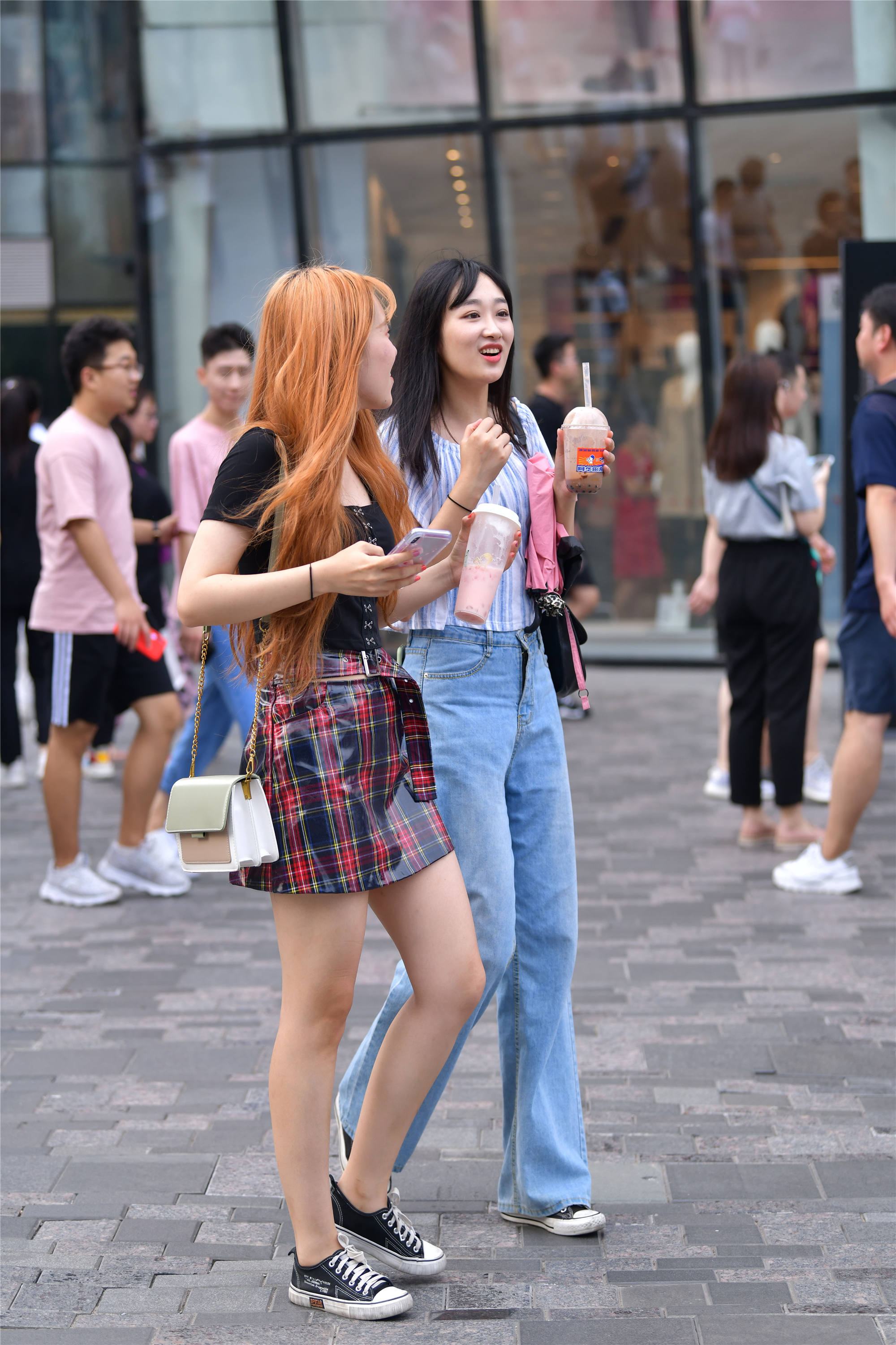 闺蜜时间,穿着不一样的服装,可以格子展示自己,按照自己的想法去穿搭,这一对年轻的闺蜜,一位是黑色与红色组成的格子短裙,漆皮的效果非常好看,也有质感,高腰的款式,会穿出显身材的效果,一件修身的黑色半袖,搭配平底,有着小女生的搭配效果,她的闺蜜是一件直筒的牛仔裤搭配竖条格的小衫,也是很简约的搭配,但是有着初秋的感觉。