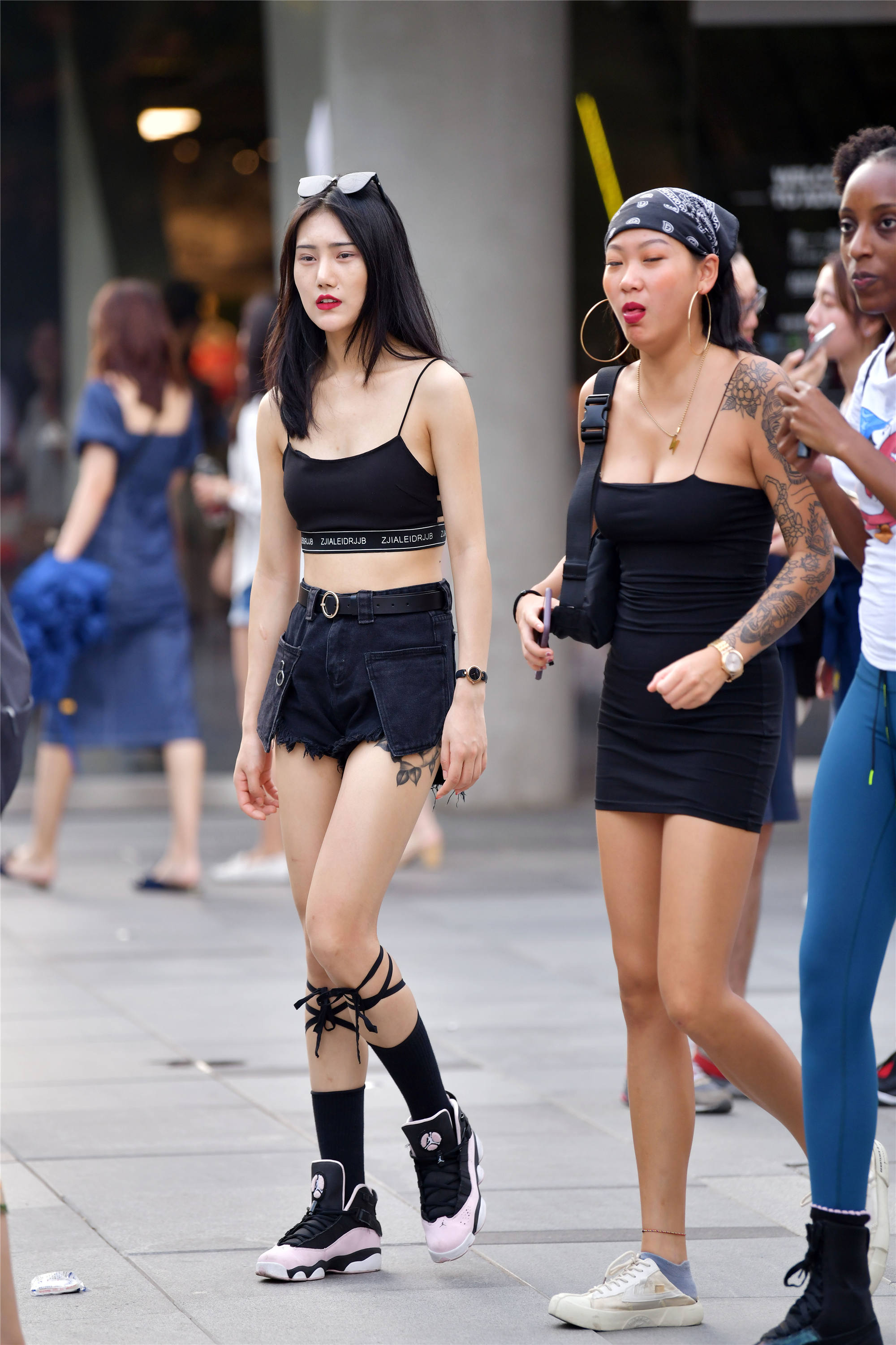 有一位会搭配的闺蜜,你会和她一起逛街么?看一下这一对闺蜜,她们都是以黑色服装搭配为主,却各自搭配出自己的味道来,一位是吊带胸衣搭配牛仔短裤,黑色高筒袜搭配一双运动,非常有层次的穿搭,也很会搭配的一位美女,她的闺蜜是一件吊带连衣裙,修身的效果,搭配头上的发带,一个超大的耳圈,有着很嘻哈的搭配感觉,古铜色皮肤,也很个性。