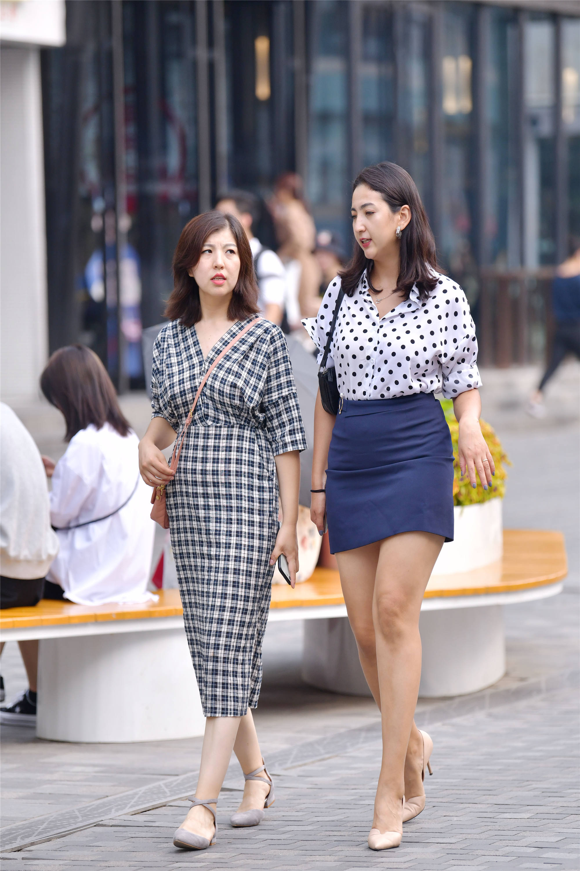 有了不同的穿搭,才会展现出自己的个性来,看一下这两位姐妹,一位穿着半袖的黑白色格子长裙,高腰的设计,显得身材比例很好,而且不挑身材,很多人可以尝试一下这样的搭配,她的闺蜜是一件蓝色高腰筒裙,搭配一件白色黑斑点的小衫,脚下一双米黄色的尖头细高跟,更好的衬托身材的高挑效果,也有着显瘦的味道。