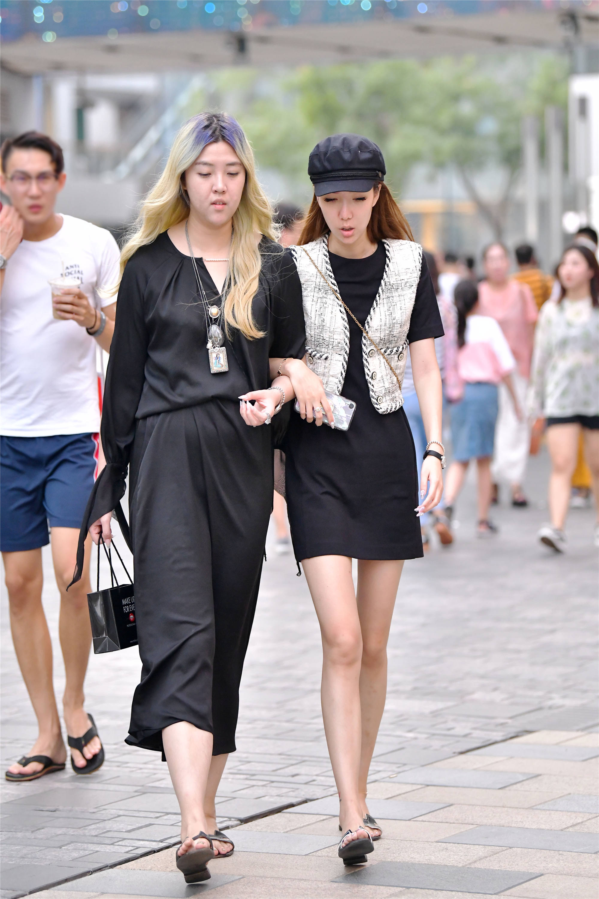 和闺蜜一起逛街,要根据自己身材选择不同的穿搭,这一对闺蜜,就很会搭配,一位身材微胖一些,选择黑色长袖连衣裙,有点宽松的效果,这样会很轻松,不会显胖,收腰设计也非常好看,显出身材比例,她的闺蜜身材匀称骨感,所以选择一款半袖连衣短裙,搭配一件浅灰色的马甲,这样会有着色彩对比的效果,还秀出大长腿,展现出自己的优势。