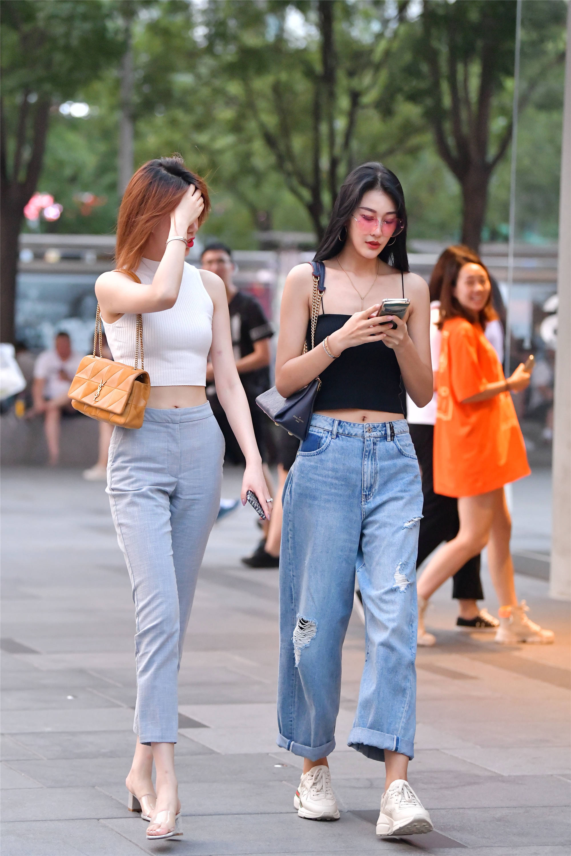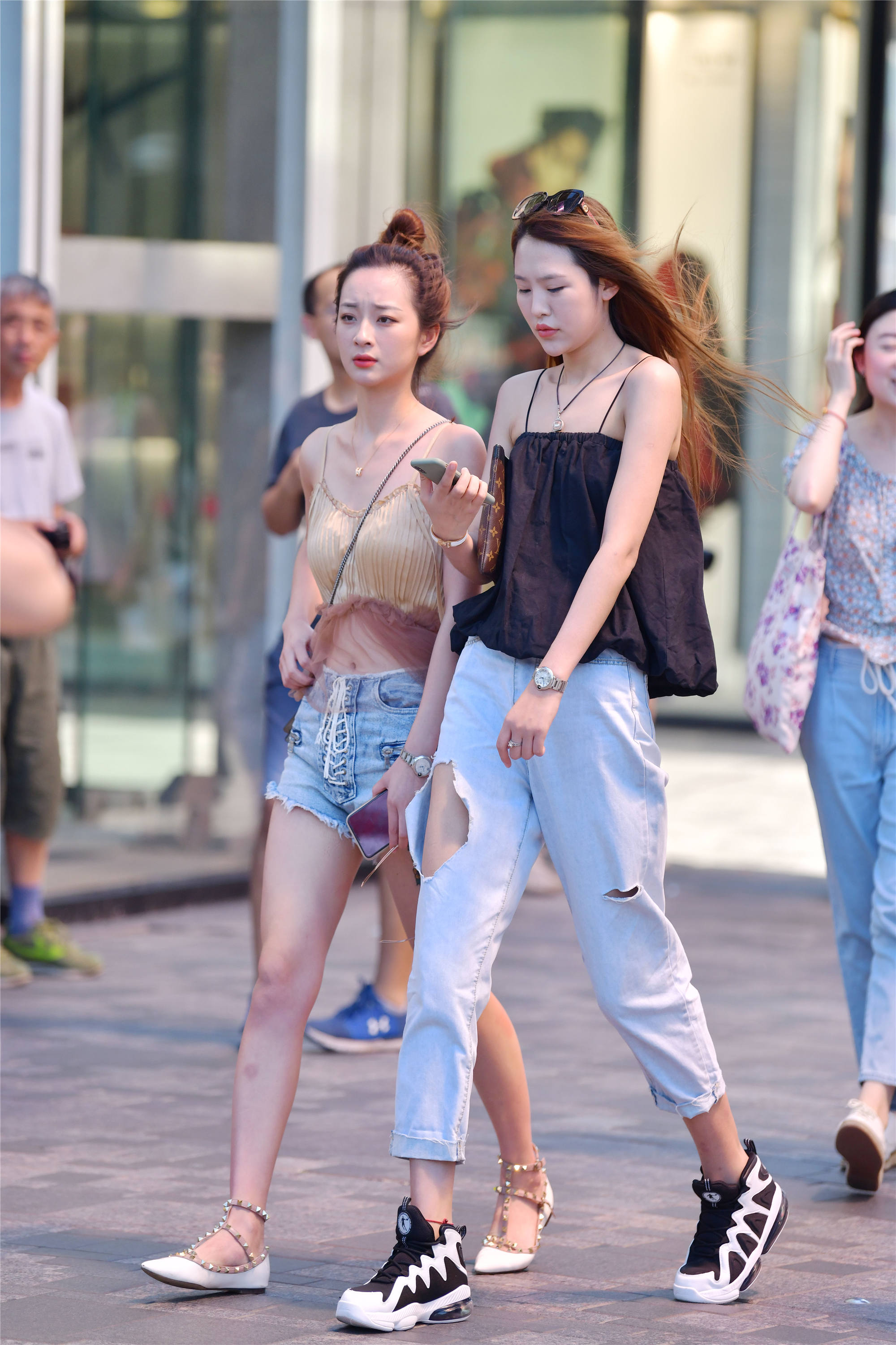 到了初秋时节,逛街的行人搭配也有了一点小变化,特别是在傍晚的时候,早晚天气凉爽,白天也不是闷热,所以这个时节特别适合逛街,看一下这一对闺蜜的搭配,一位穿着九分的牛仔裤,搭配出大长腿的效果,黑色吊带,搭配出很精致的味道,脚下的运动鞋又会有着休闲感觉,她的闺蜜是牛仔短裤搭配吊带,展现风格不一样,才会搭配出差异的美感。