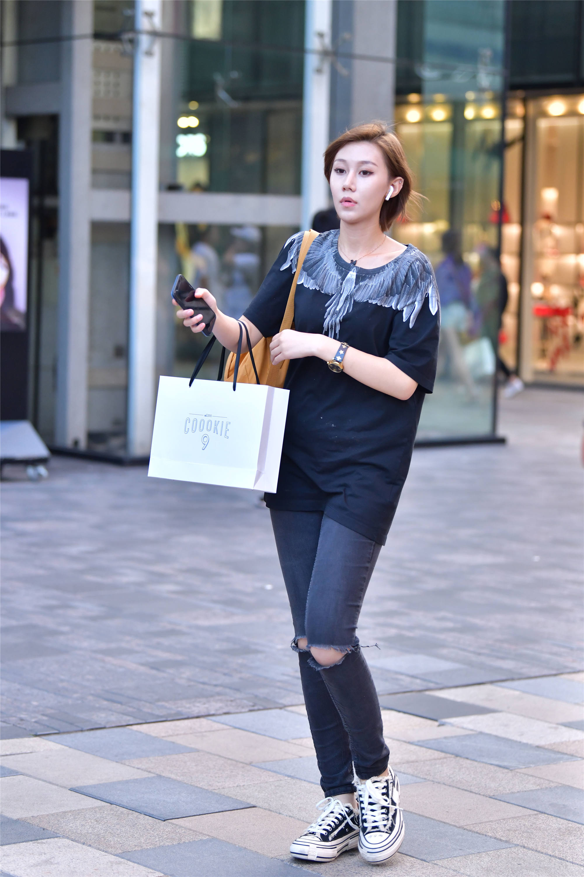 来这里的每一位姑娘,不都是搭配的非常好看,但是她们选择的衣服,可以运用一些小的技巧,可以改变一点风格,会展现出更加时尚的效果,这位姑娘选择黑色T恤搭配黑色牛仔裤,牛仔裤膝盖处的破洞,非常个性,修身的款式,也搭配出不错的曲线美,如果是把体恤挽起一点,展现一下牛仔裤的裤腰,这样会有突出身材比例的效果,让人看起来更加精致。