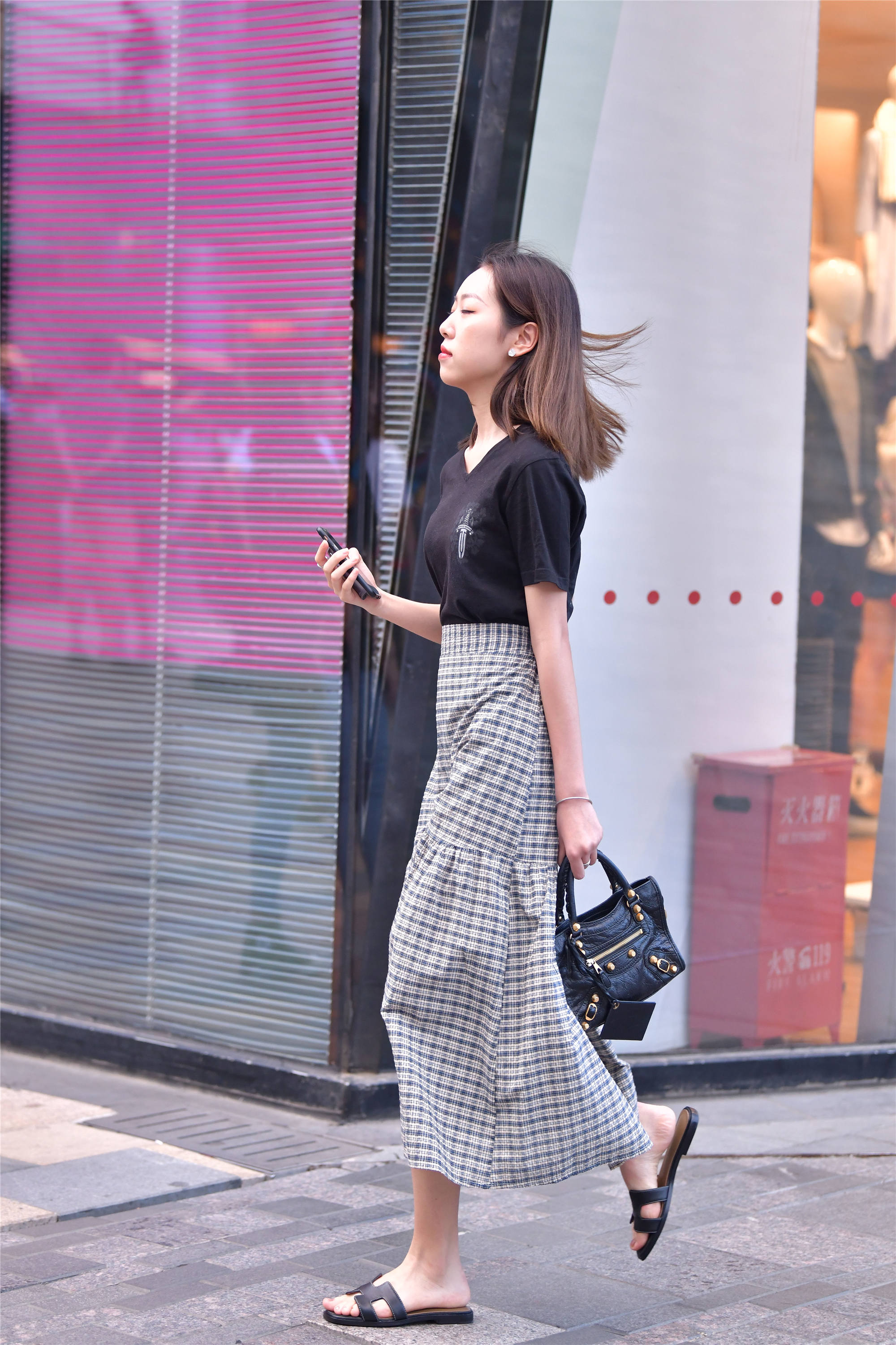 简约风格的搭配,其实不难,最难的是过得去心里的那个搭配的槛,很多人说我想穿出漂亮的效果,但是在挑选衣服的适合,会以各种理由拒绝一下服装,这款不适合自己,色彩太艳丽了什么的,那么现在看一下这位美女的搭配,色彩很素雅,一件黑色的T恤,搭配黑白色的半身长裙,高腰款式,有点灰色的效果,搭配出很精致的味道,虽然穿着一双拖鞋,依旧很美,要是穿上一双高跟单鞋,会有更好的效果。
