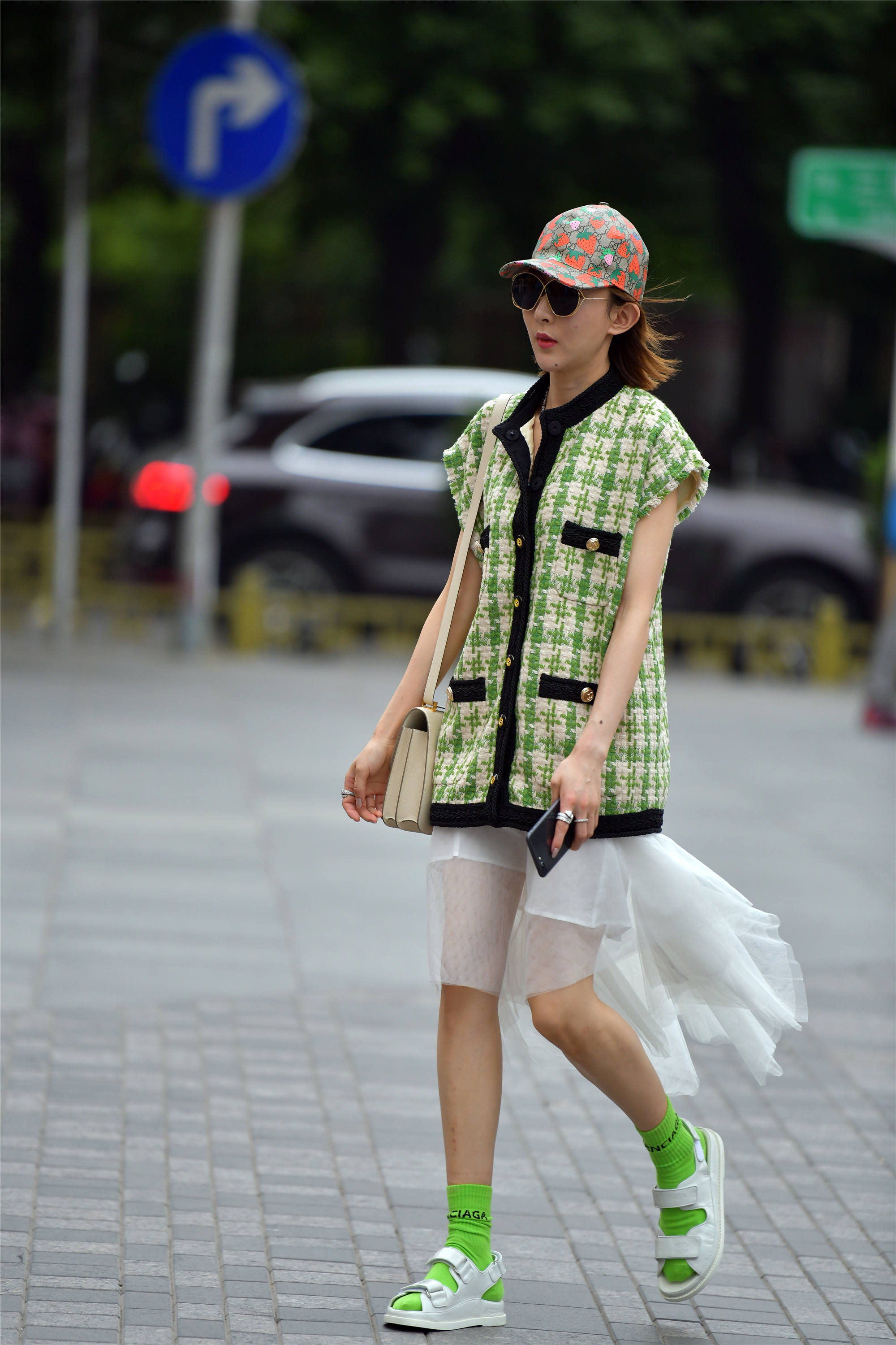小姐姐的一身搭配,有点绿色,还有这一点初秋的效果,应该是穿着一件白色的纱裙,外面一件绿色与白色的半袖外套,有点厚实的感觉,这样只露出一些裙摆,绿色袜子搭配一双白色凉鞋,这样的搭配还是比较少见,初秋这样搭配还是有着一点怀念的感觉,一顶花色的鸭舌帽,也非常个性的感觉。