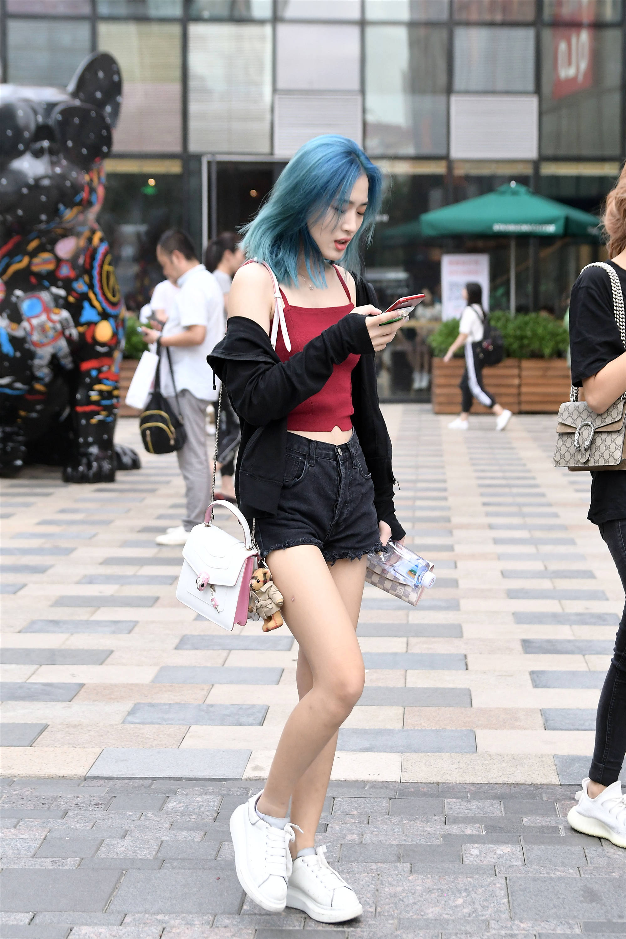 初秋时节,搭配短裤,也会有着很不错的效果,一条毛边的牛仔短裤,会搭配出很个性的味道,红色的吊带小衫,露出一点腰线位置,如果姑娘把腰背挺直,会更有气质展现,很多人习惯这种含胸状态,觉得这样很舒服,一件黑色外套,搭在肩上,显得非常个性,蓝色的渐变长发,姑娘也是一位喜欢穿搭的爱美之人。