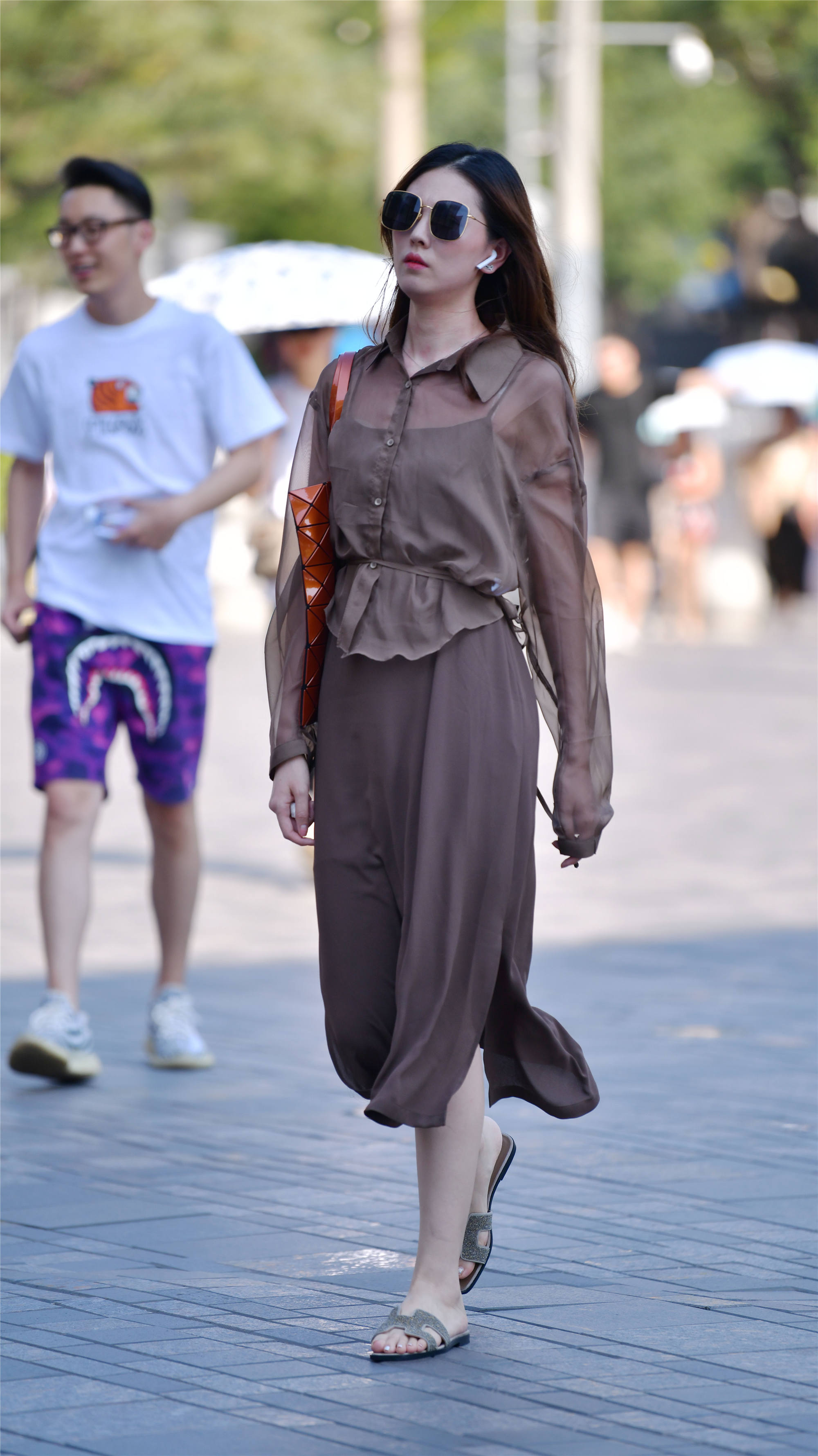 每一位适合的姑娘,都有着自己的搭配想法,在刚入秋的时节,天气虽然转凉一些,依旧还是以夏装搭配为主,这位美女选择的套装,深褐色的款式,一件纱料的小衫,长袖的款式,有着防晒的效果,还带着一点神秘的味道,搭配一条宽松的长裤,九分的长裤,裤脚开叉,走路非常潇洒,很喜欢这种洒脱感觉,脚下的真皮H拖鞋,很流行,穿着也很舒服,逛街时候,也展现出休闲的味道。