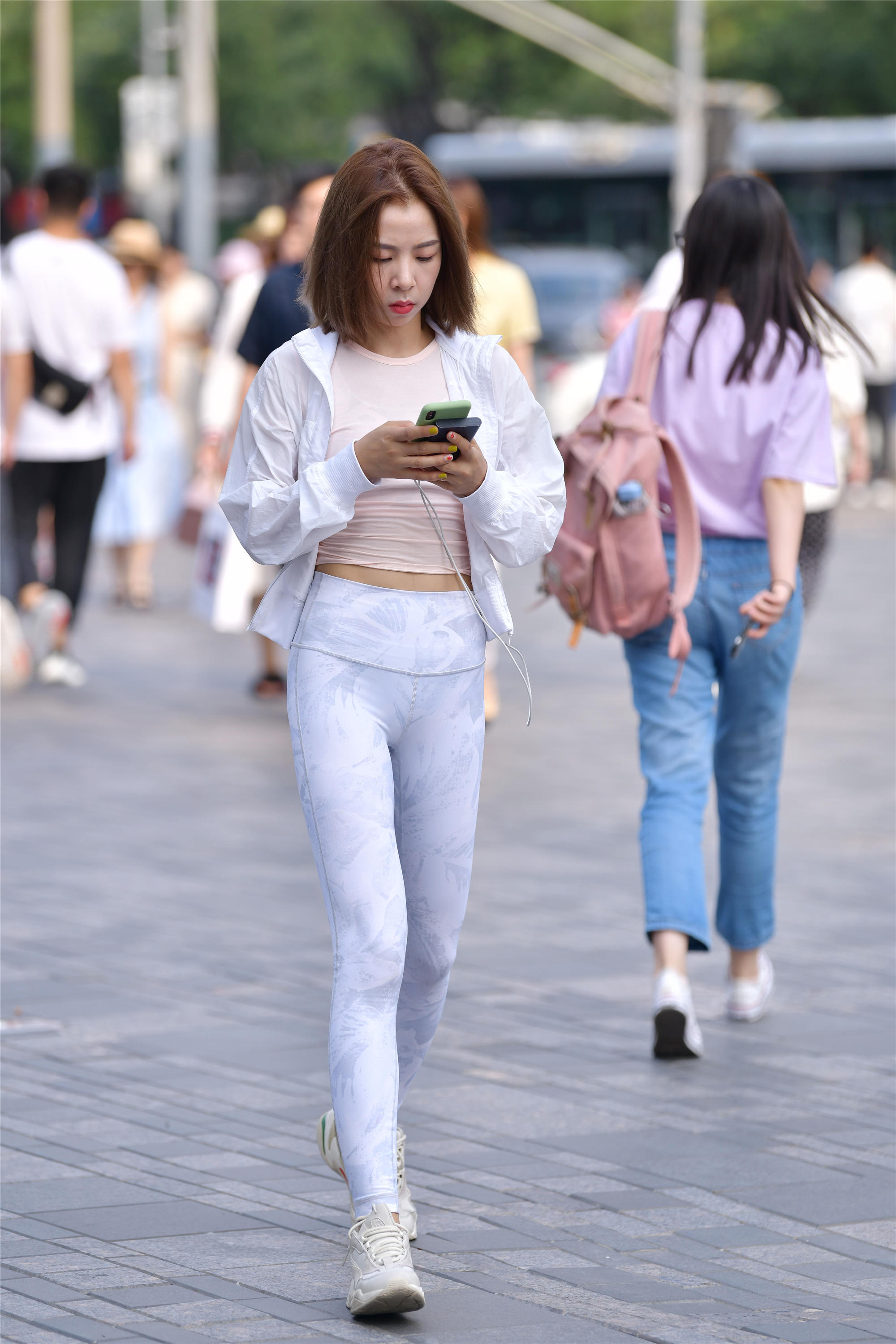 现在流行城市健身,很多小姐姐也在坚持健身,让自己身材变得更好,穿着更加漂亮的衣服,现在的街上也可以看到很多穿着健美裤的姑娘,在展示她们的身材,看一下这位美女,白色瑜伽裤,非显身材,搭配一件米粉色的衬衣,外面一件防晒服,脚下穿着一双运动鞋,这样更加符合这一身搭配,穿搭很简单,可以逛街,也可以直接去健身房,运动的美女就是有活力。