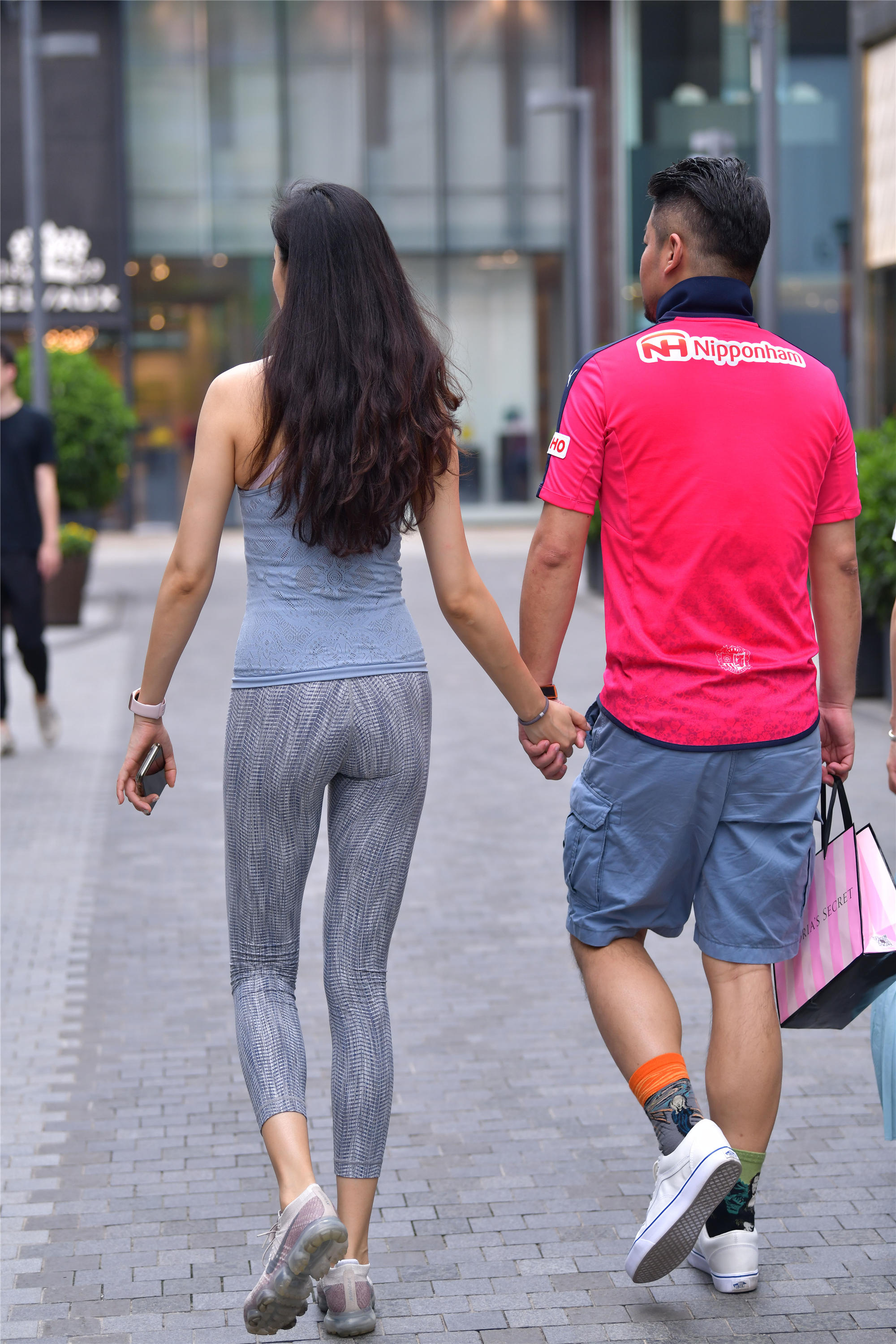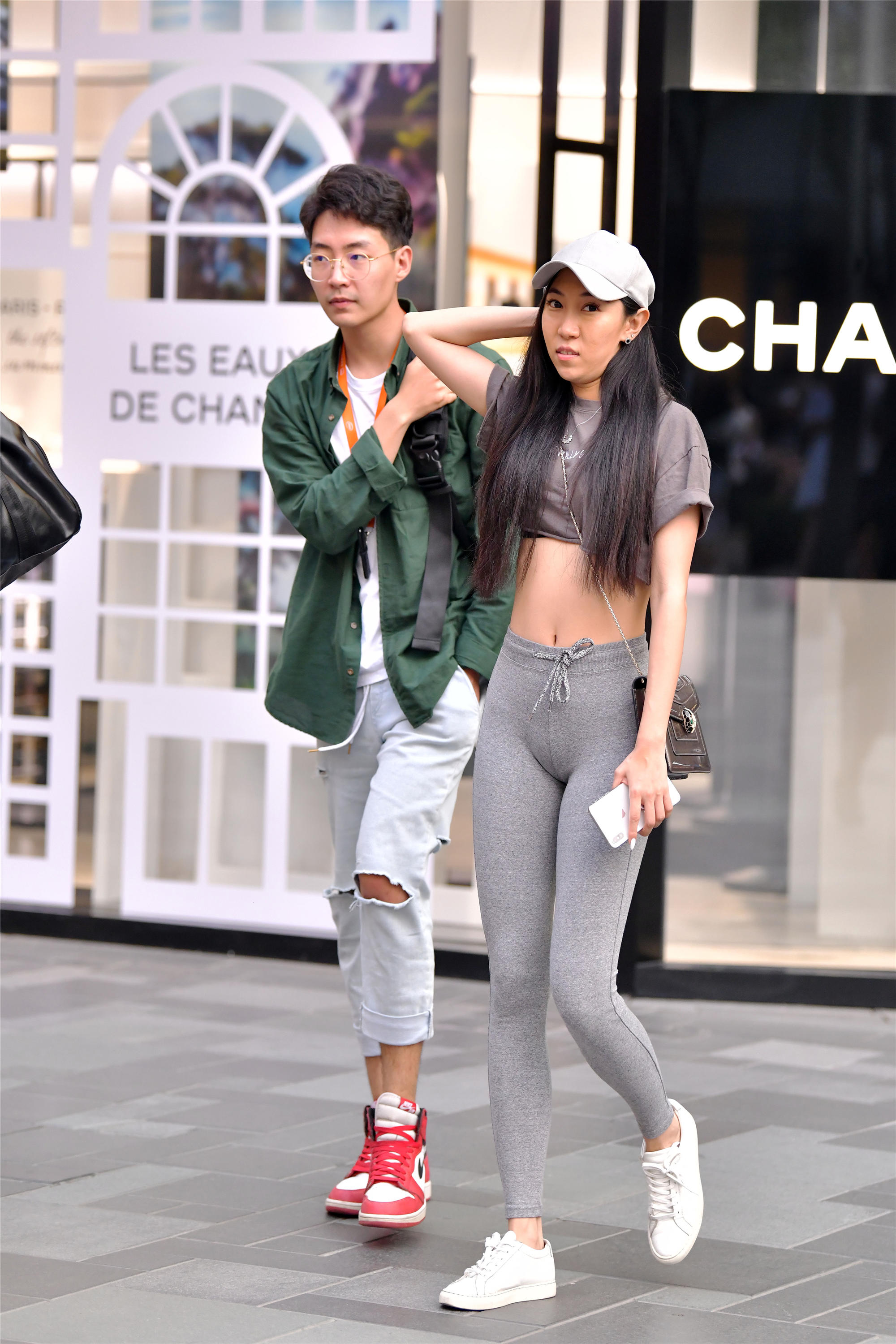 每一位穿着健美裤的姑娘,她们的搭配都不一样,展示出不一样的时尚感觉,这位美女选择深蓝色的健美裤,搭配一双运动鞋,一件浅灰色的背心,看着更有运动的感觉,走过时尚街区,是为了展示一下自己,也更像是要去健身房锻炼的感觉。