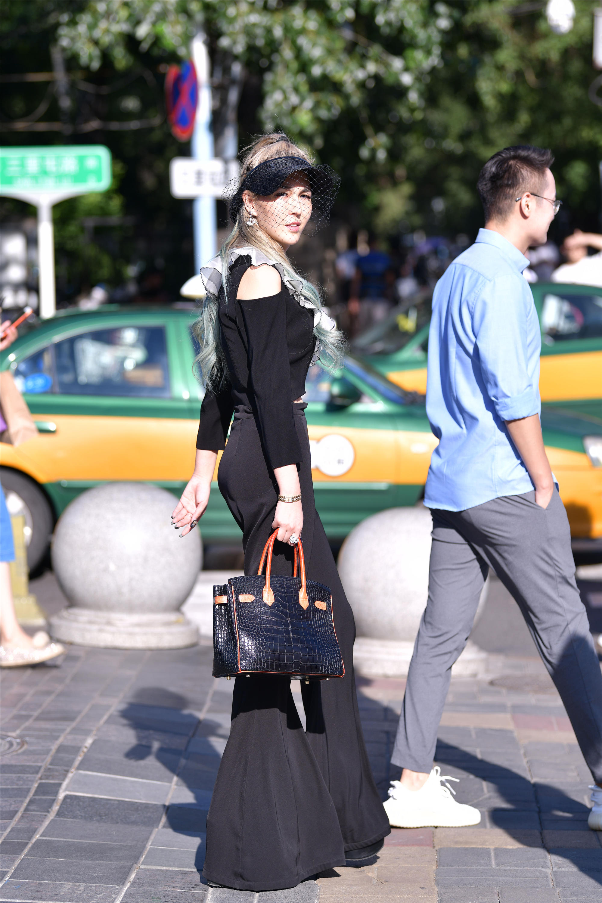 有时候穿着高跟鞋,不一定要露出来,但是却要展示出穿高跟鞋的效果,这样会有着不一样的美展示出来,这位美女选择一款黑色的喇叭裤,高腰的款式,显得身材比例特别的好看,也搭配出富有曲线美的感觉,而且让你看出来她穿的高跟鞋,绝对不低,这是非常有意境的搭配,一件黑色小衫,露出肩膀位置,非常好看,黑色网纱遮阳帽,增加神秘感觉。