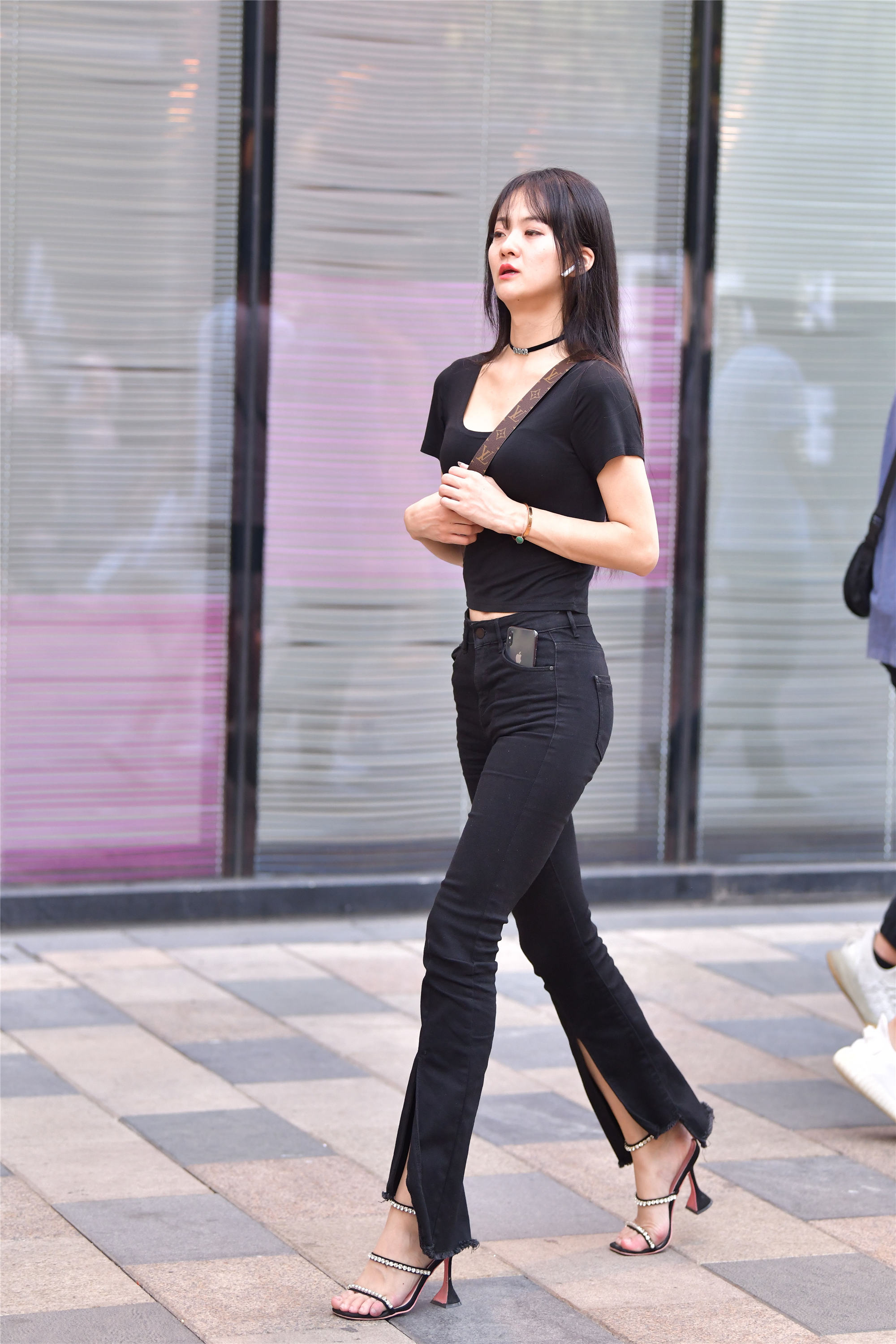 选择牛仔裤的时候,有些人会选个性一点的,毛边,开叉或者破洞的,增加层次感和个性,这是其他裤子不能比拟的,这位美女选择一款修身的黑色牛仔裤,毛边的裤脚和小腿的开叉设计,增加层次感,也走出飘逸的味道,脚下一双高跟凉鞋,更好的衬托她的身材高挑,搭配一件黑色的半袖,初秋时节搭配黑色,也可以穿出自己的感觉,要选择适合自己的服装。