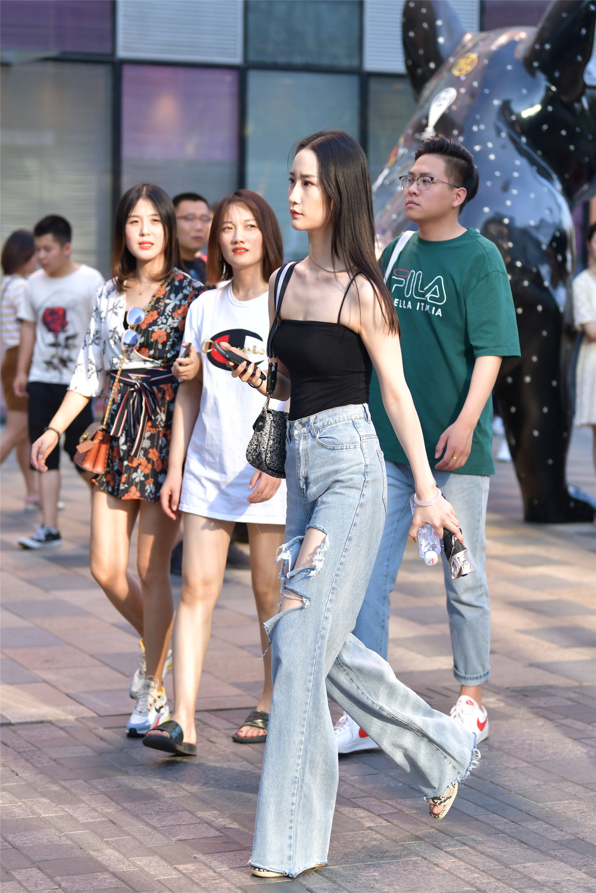 每次挑选牛仔裤的时候,裤腿都很长,很大一部分人会选择把牛仔裤的裤脚做一下,让长度适合自己的腿长,当然也会遇到一些直接搭配的,看一下这位美女,她的直筒牛仔裤,不仅有着破洞的效果,裤脚在高跟鞋的衬托下,刚好碰到底面,遮挡住高跟鞋,这样显得神秘,搭配一件黑色吊带,简约个性,穿出自己的味道来,也显得身材很好。