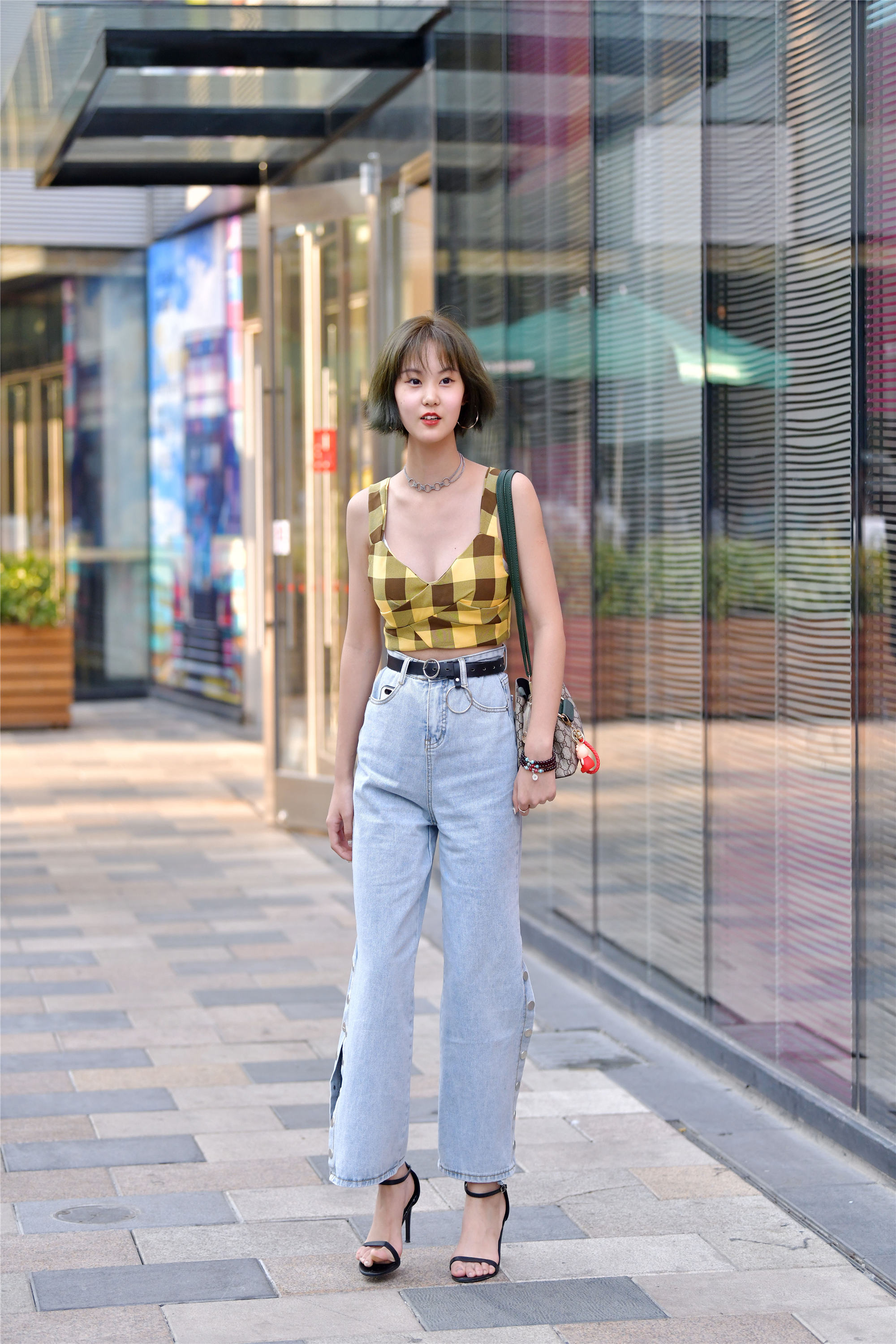 穿着牛仔裤,搭配高跟凉鞋,也是一种很好的组合,看着变得精致,这位美女选择直筒牛仔裤,侧面的金属扣,可以让牛仔裤变成开叉的效果,增加层次变化,黑色的针扣腰带,实用又好看,一件黄色格子吊带背心,搭配出很精致的效果,也凸显身材比例,黑色一字扣的高跟鞋,更好的衬托身材,这样搭配出先身材比例,有高挑有型的效果,小姐姐是不是很会搭配?