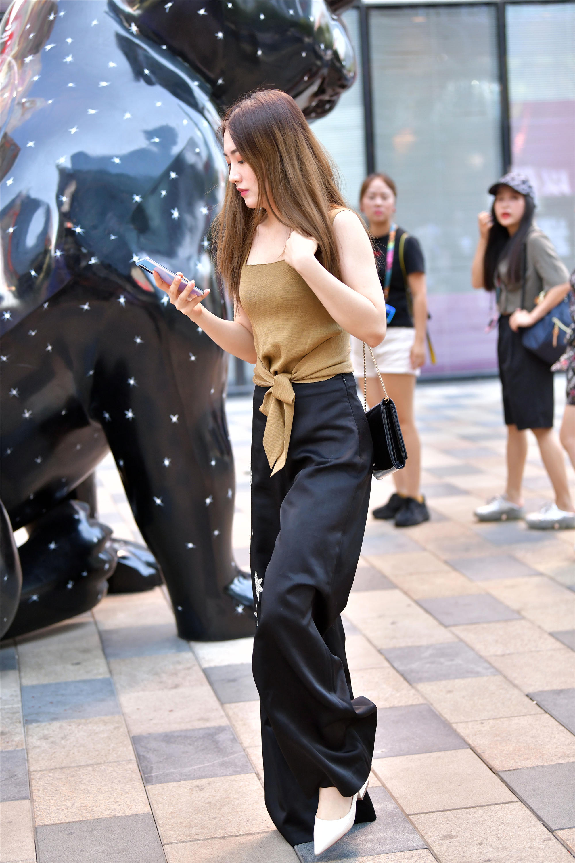 很多时尚的姑娘,喜欢搭配出个性,在初秋时节,选择长裤,也要穿出自己的味道来,那么选择什么样的长裤呢?看一下这位美女,选择一款宽松的长裤,高腰的款式,会搭配出很好的身材比例,裤脚到地面,这样会显得非常个性,而且收腰很细,和宽松的裤腿对比,非常好看,一件棕色的吊带小衫,前面衣襟系一下,显得更有层次感。