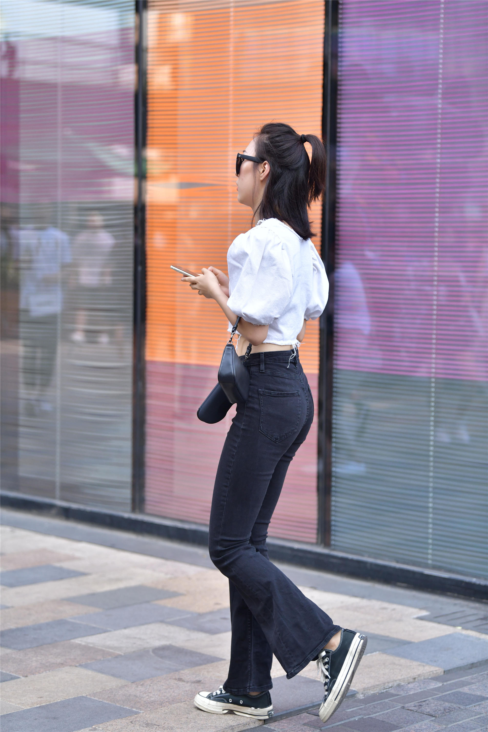 到了秋天,可以选择牛仔裤来搭配,而多种多样的牛仔裤怎么选择?就看个人的喜好了,这位美女选择一款修身的小喇叭裤,高腰款式,非常显身材,也搭配出曲线效果,膝盖以下的散开,形成小喇叭口的效果,搭配一双平底帆布鞋,简单个性,一件白色小衫,简单个性,而且刚好露出牛仔裤的裤腰,姑娘非常会搭配自己。