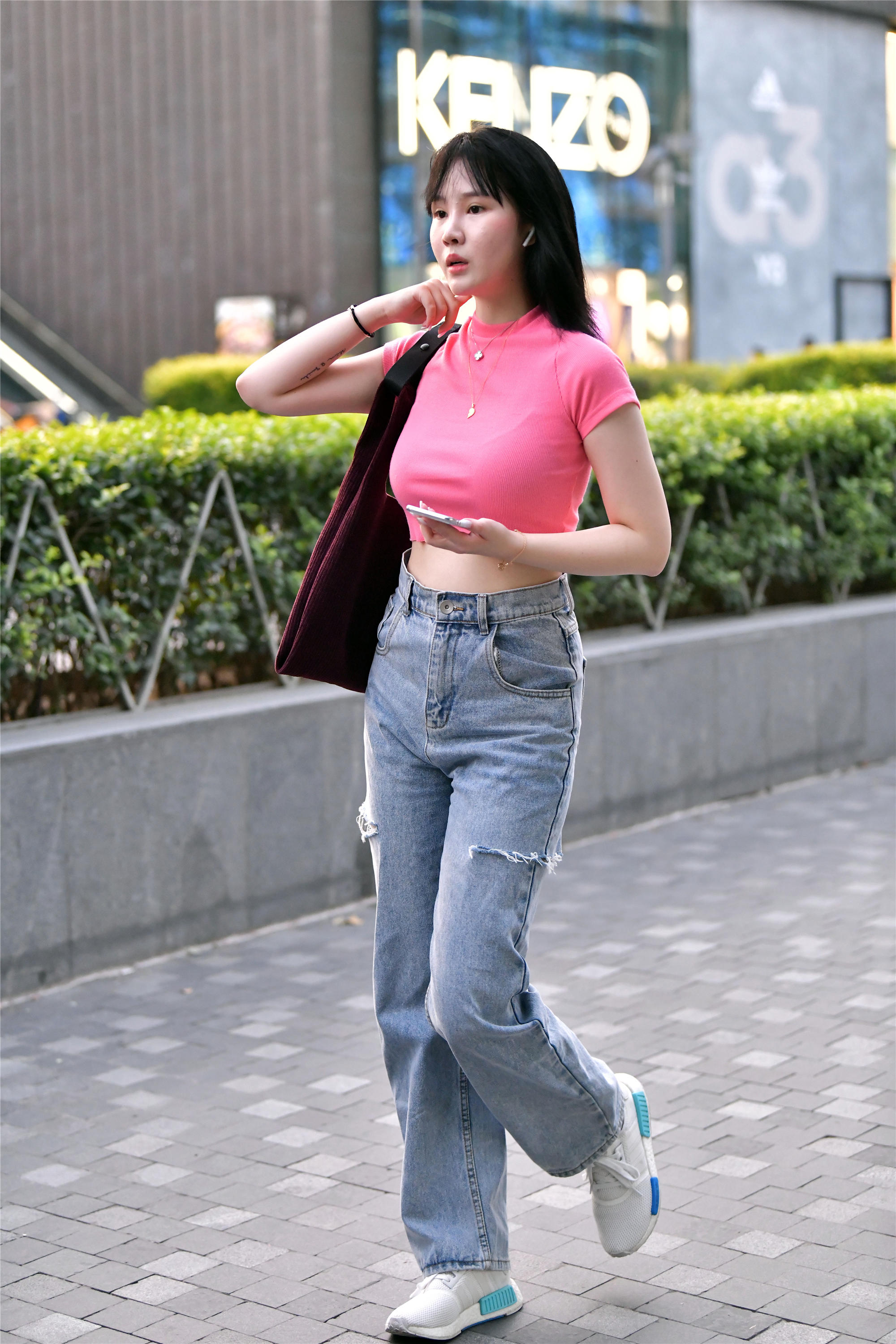 很多人都会搭配高腰牛仔裤,很容易搭配,这位美女选择一款蓝色的高腰牛仔裤,直筒裤腿,搭配出很精致的效果,破洞的处理,很好看,搭配运动鞋,也符合她的风格,逛街还不会很累,一件粉色的短衣襟修身半袖,高领的款式,露出一点腰腹部,非常漂亮的搭配,时尚的姑娘,要知道怎么去展示自己,也要会穿出不同的风格。