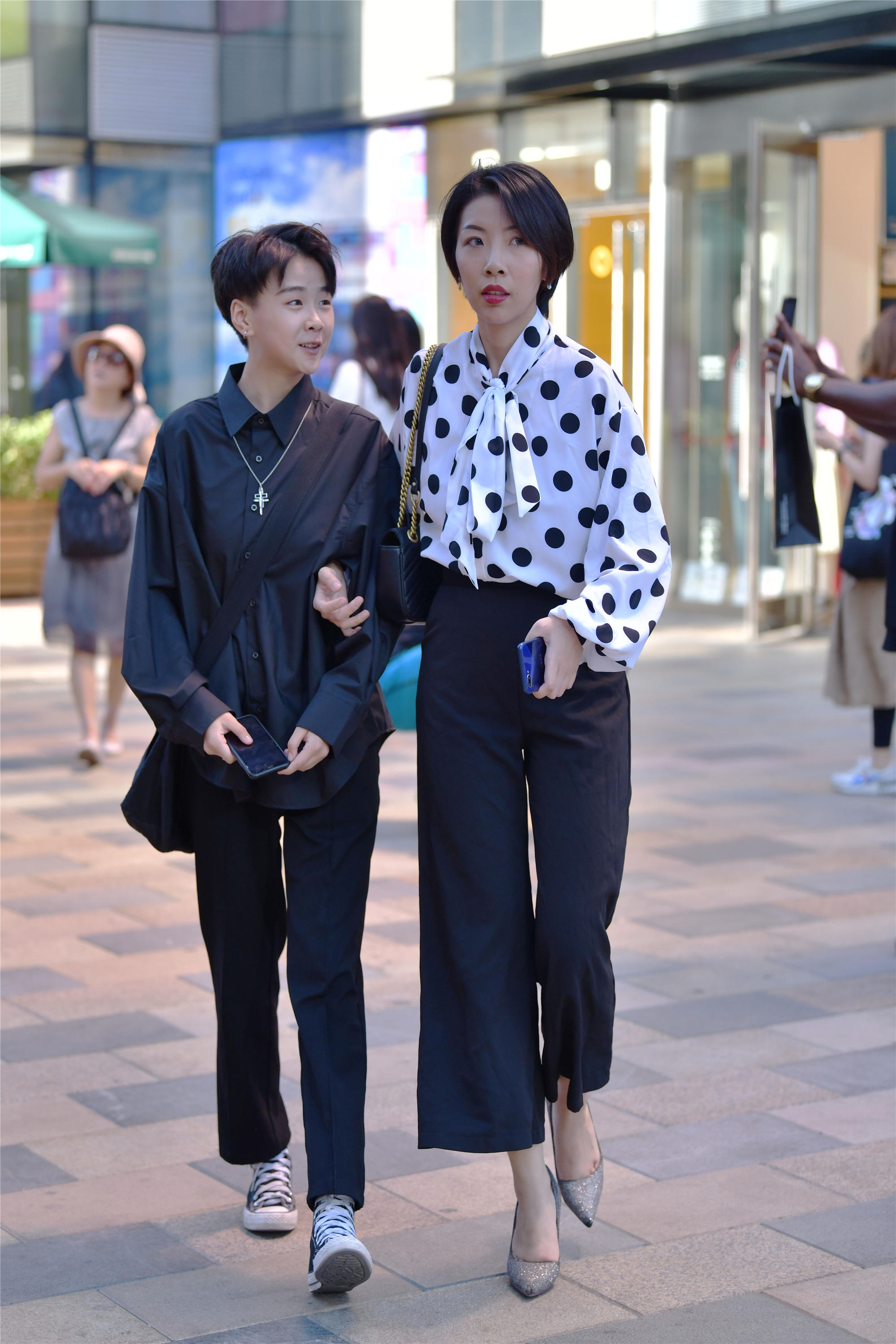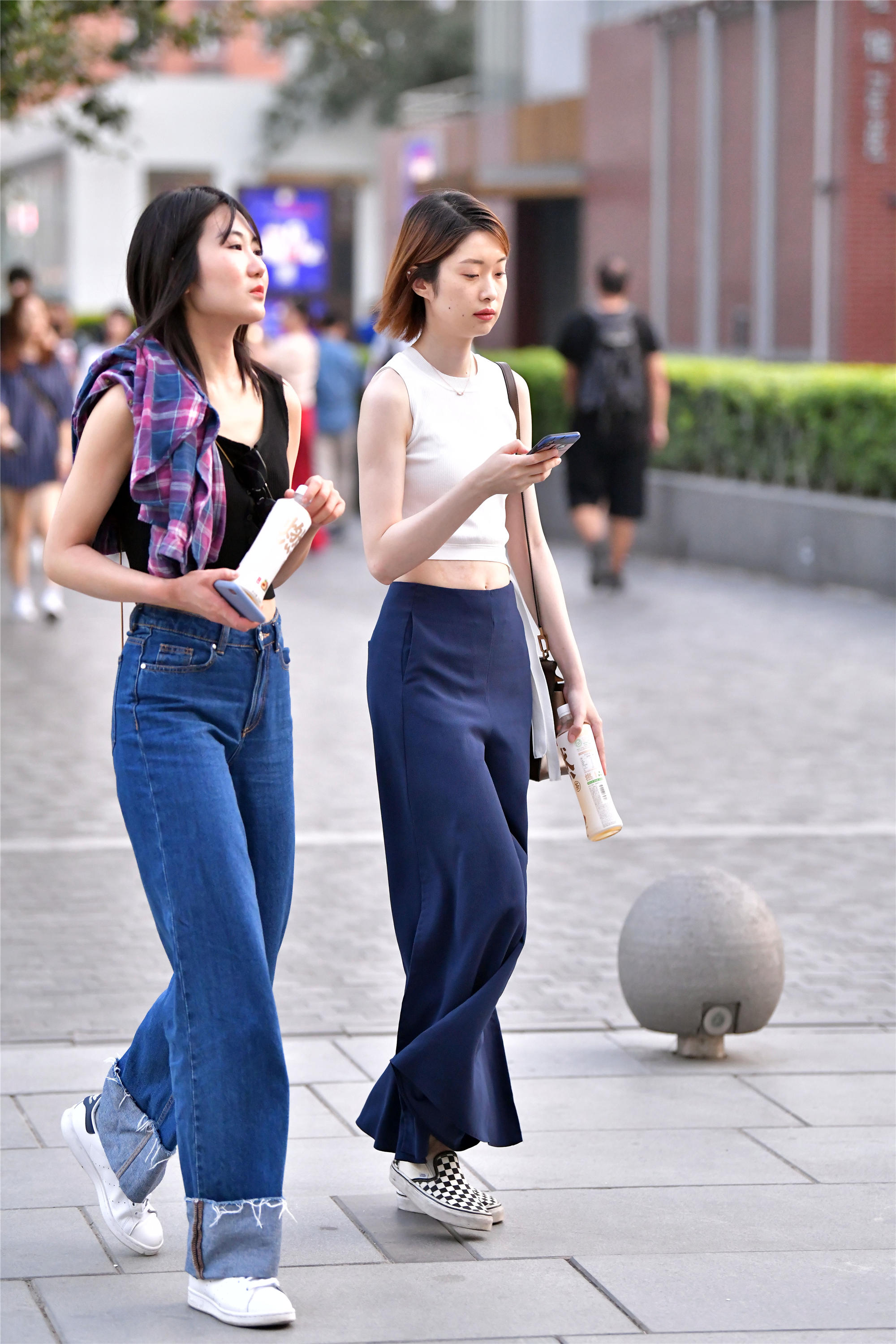 秋天是很好搭配长裤的时节,宽松的裤子,会显得身材很好看,如果觉得自己腿粗,或者腿型不是很直的姑娘,可以尝试一下宽松直筒这一类的裤子搭配,会有很好的效果,这一对闺蜜都选择宽松的长裤,一位是牛仔长裤,将裤脚挽起很大一部分,搭配小白鞋,简单又好看,她的闺蜜是一件深蓝色的长裤,有点洒脱感觉,一件白色续修小背心,露出一点腰腹部,非常精致的效果就搭配出来了。