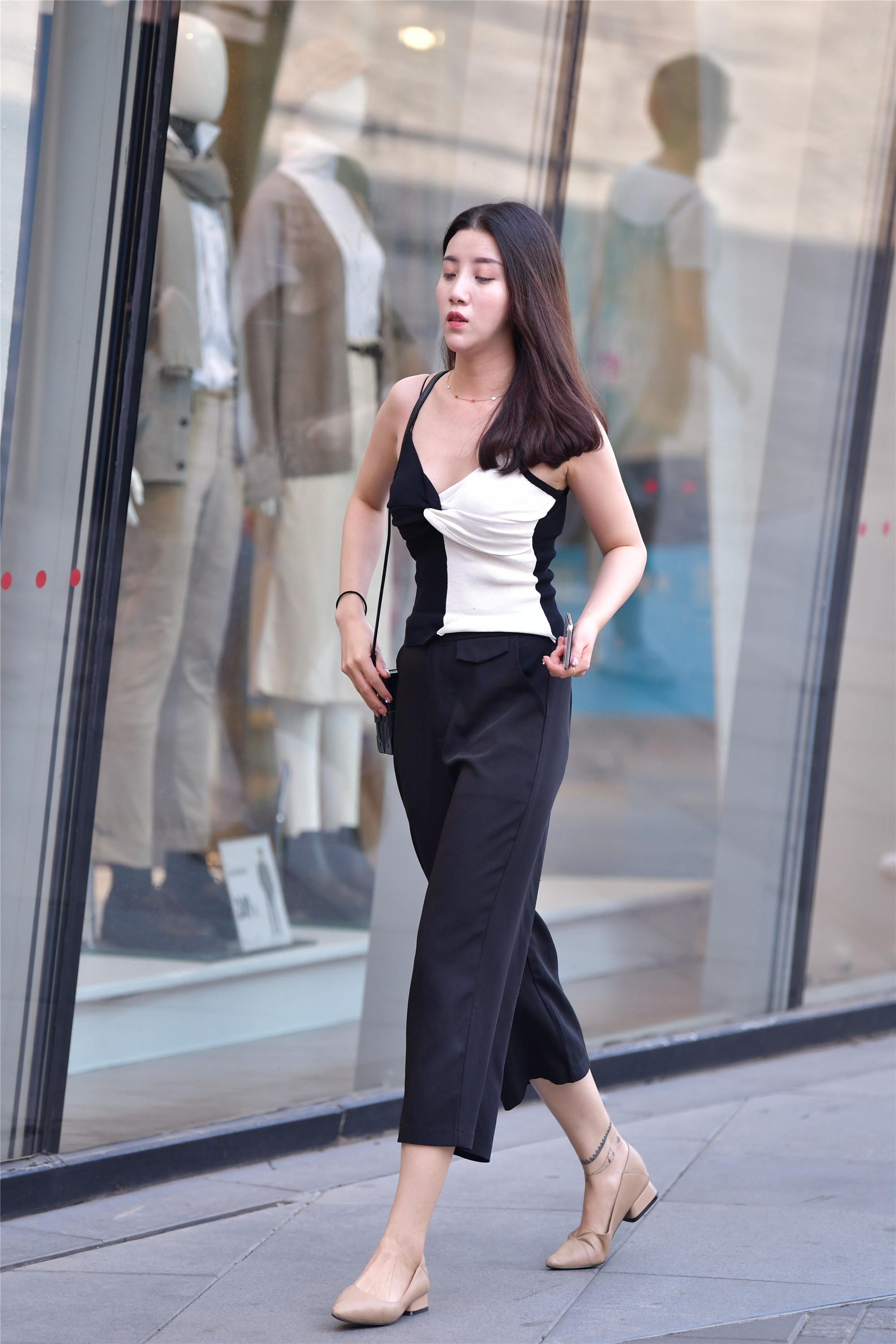 说到长裤,不一定能够非要搭配到脚面的,有时候七分裤会搭配出干练的风格,露出一点小腿的位置,更显身材纤细,这位美女选择一款黑色七分裤,裤子略显宽松,这样会衬托小腿的纤细,有着显瘦的效果,一件黑白色的拼接吊带,修身效果很好,也显身材曲线,脚下的单鞋,虽然有个1厘米的鞋跟,简单个性,如果高一些,会更显身材的高挑。