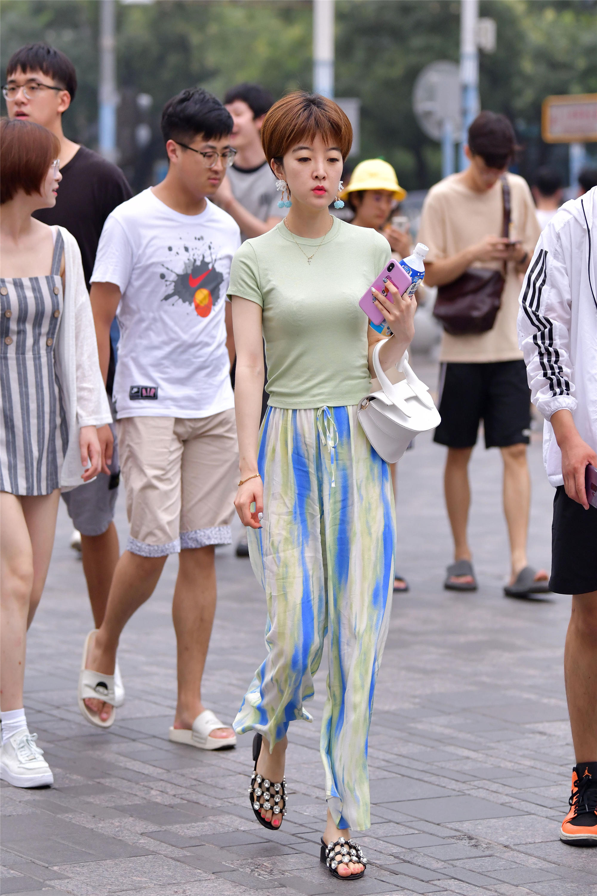 每一位逛街选择长裤的美女,她们选择的长裤,也都不一样,所以穿出来的效果也不愿意,这位美女选择一款面料很松软的长裤,走路的适合,非常飘逸的效果就穿出来了,蓝色和黄色的一点渐变,搭配出很精致的感觉来,一件浅绿色的修身半袖,色彩不是显眼,却搭配出很清新的感觉,一头精致的短发,有着一点干练风格。