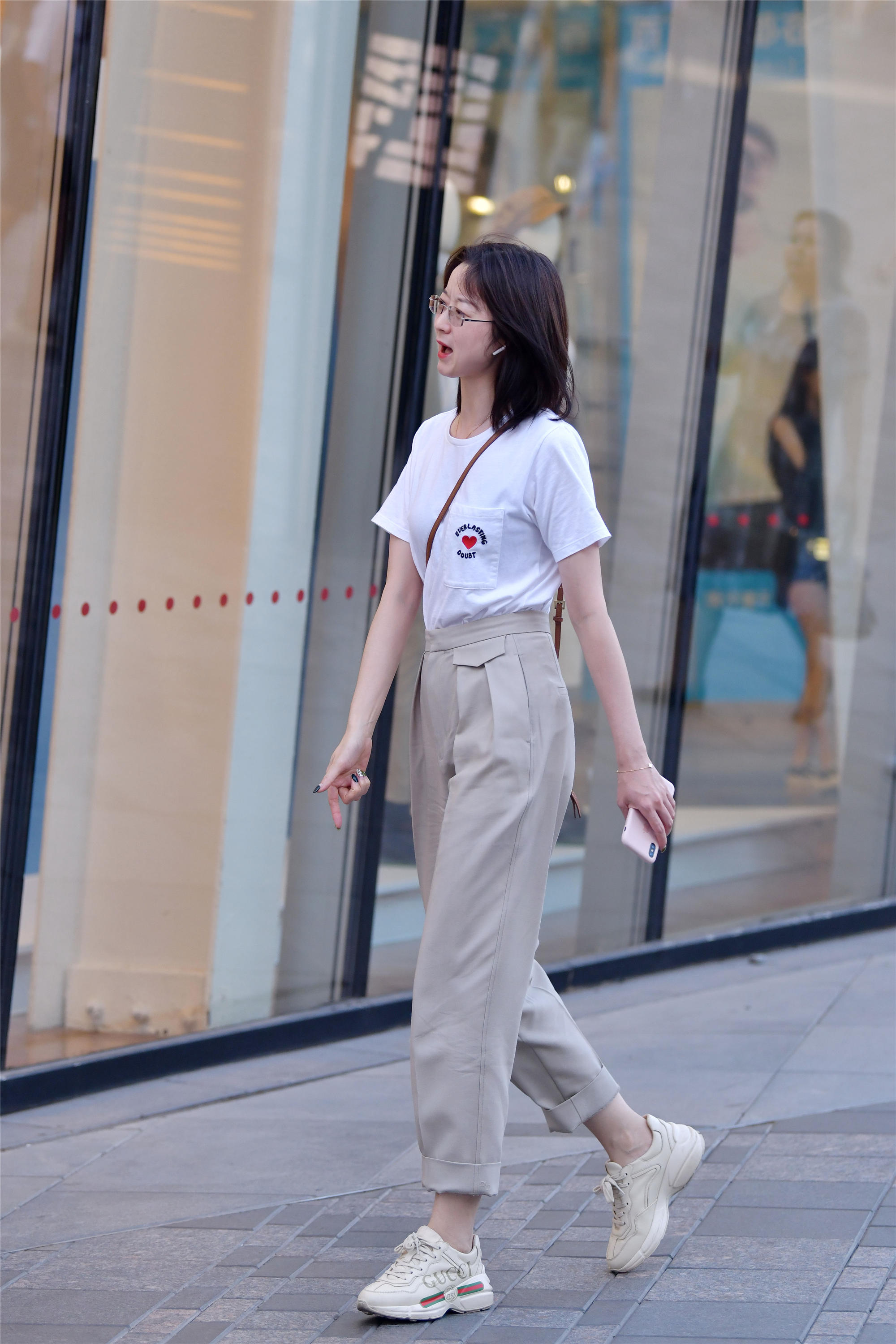 简约的长裤,也会搭配出很精致的感觉,所以选择长裤的时候,也要选择适合自己的版型,这位美女的灰色高腰长裤,裤脚挽起一点,成为九分裤,露出脚踝,还有脚下的米色运动鞋,非常简约的休闲风格,一件白色的半袖,这样搭配有着显年轻的效果,很不错的减龄搭配。