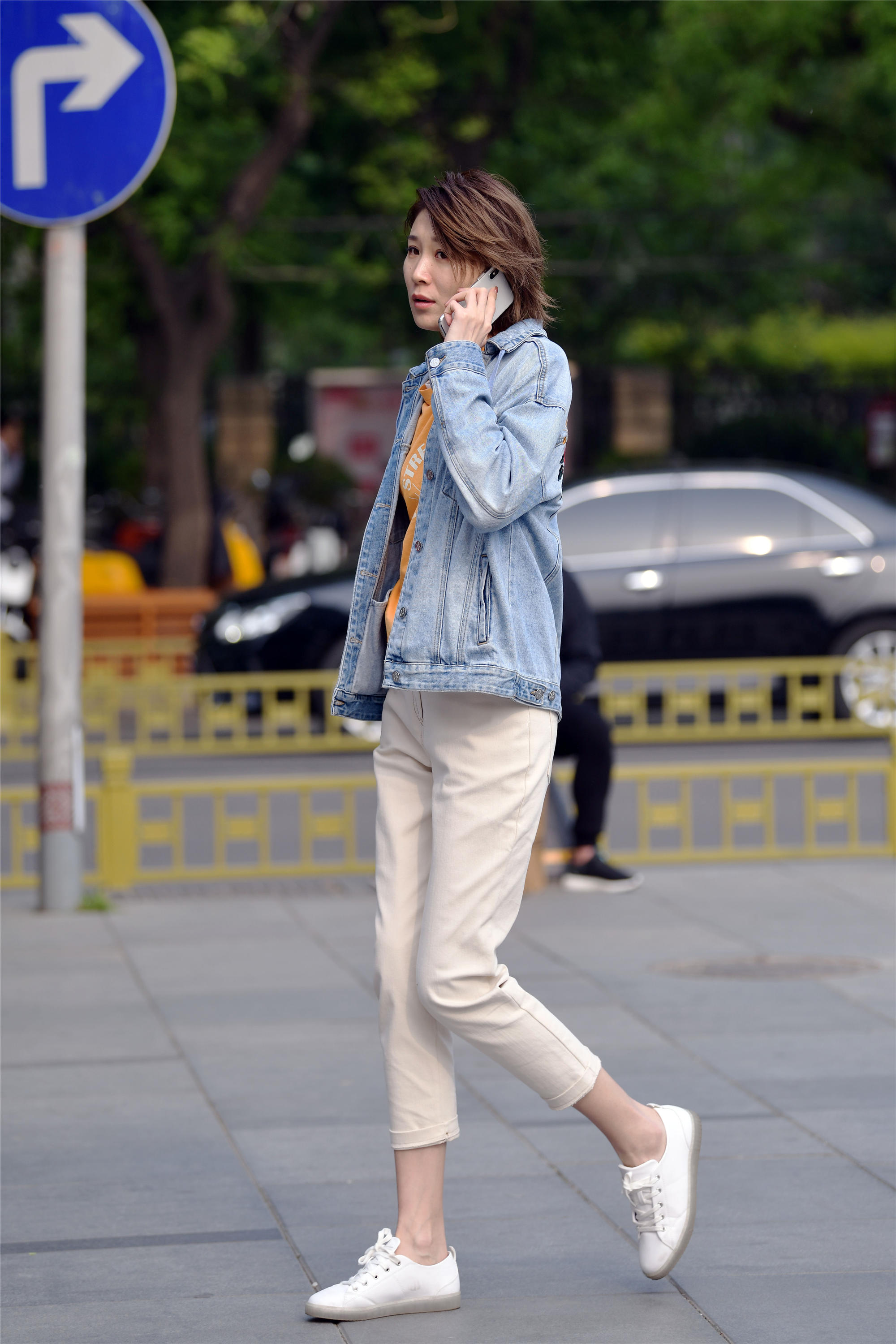 七分的收脚裤,有点挑身材,窈窕匀称的姑娘,可以搭配,米黄色很简单,也显得人很干净,露出一点小腿和脚踝,脚下一双白色系带鞋,橙黄色的内搭,外面一件牛仔夹克,简单又好看,搭配出很精致的效果,一头碎发,不是很长,可以显得很休闲,好看的搭配,会让你变得更加有味道,长裤也可以在秋天搭配出自己的感觉来。
