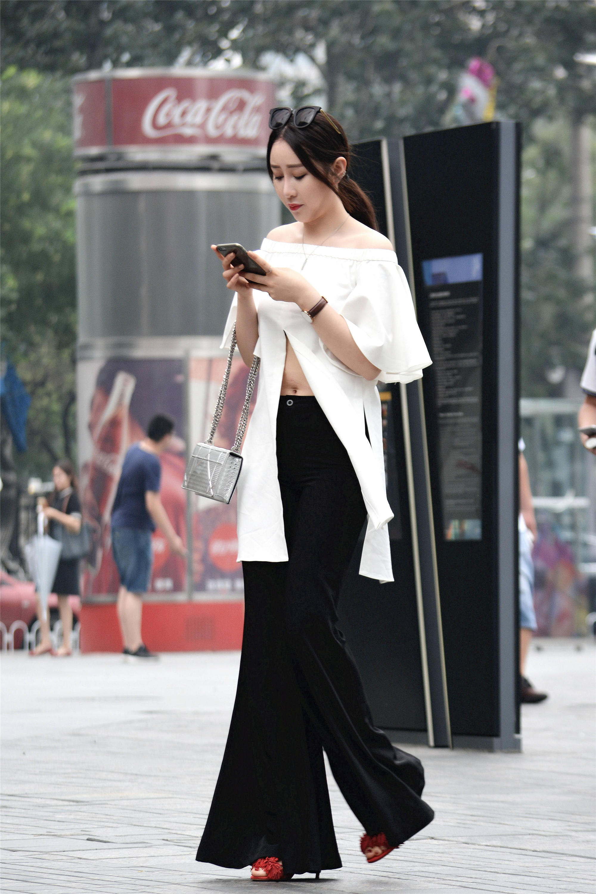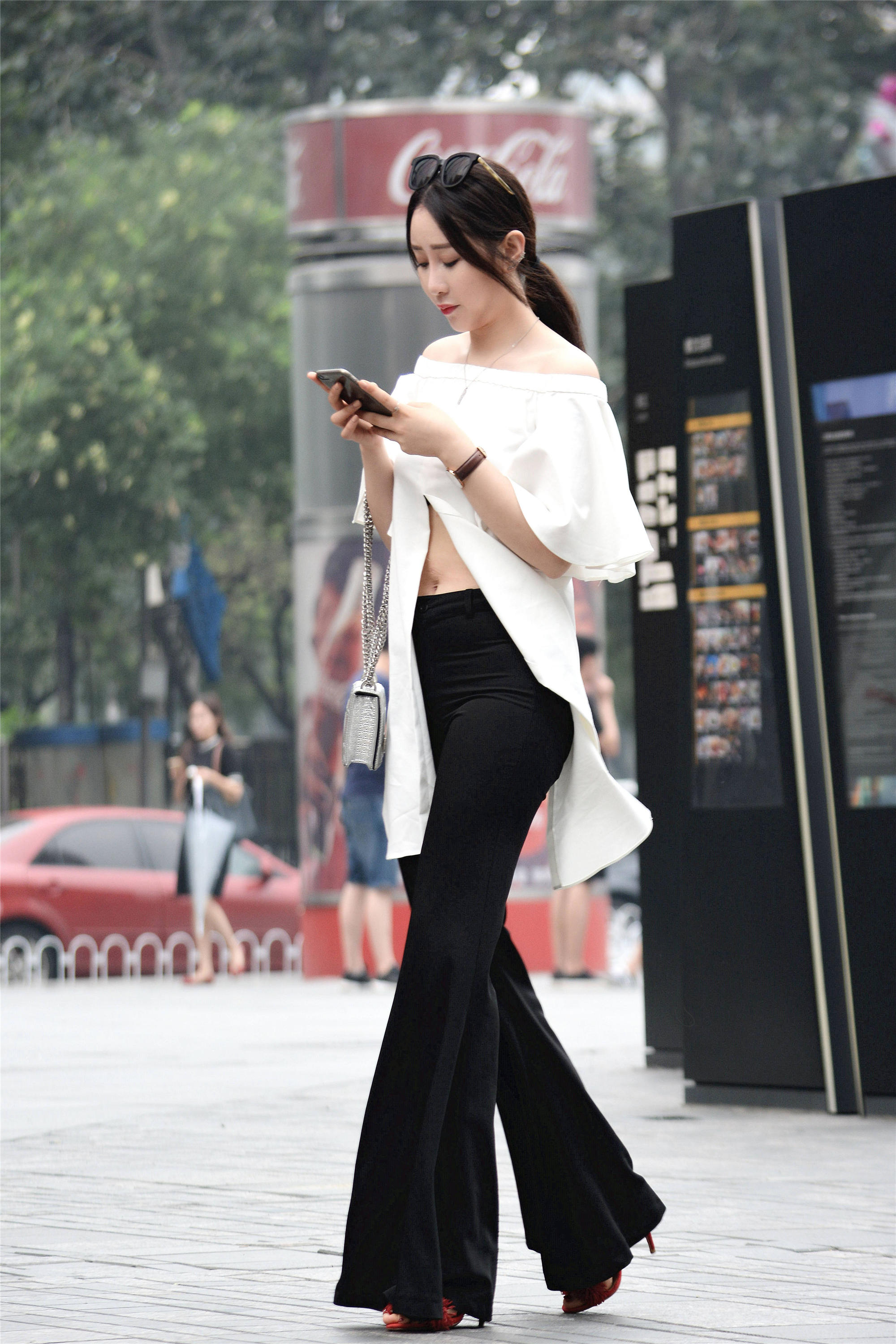 喇叭裤不一定要选择牛仔的,搭配高跟鞋凉鞋,依旧有洒脱味道