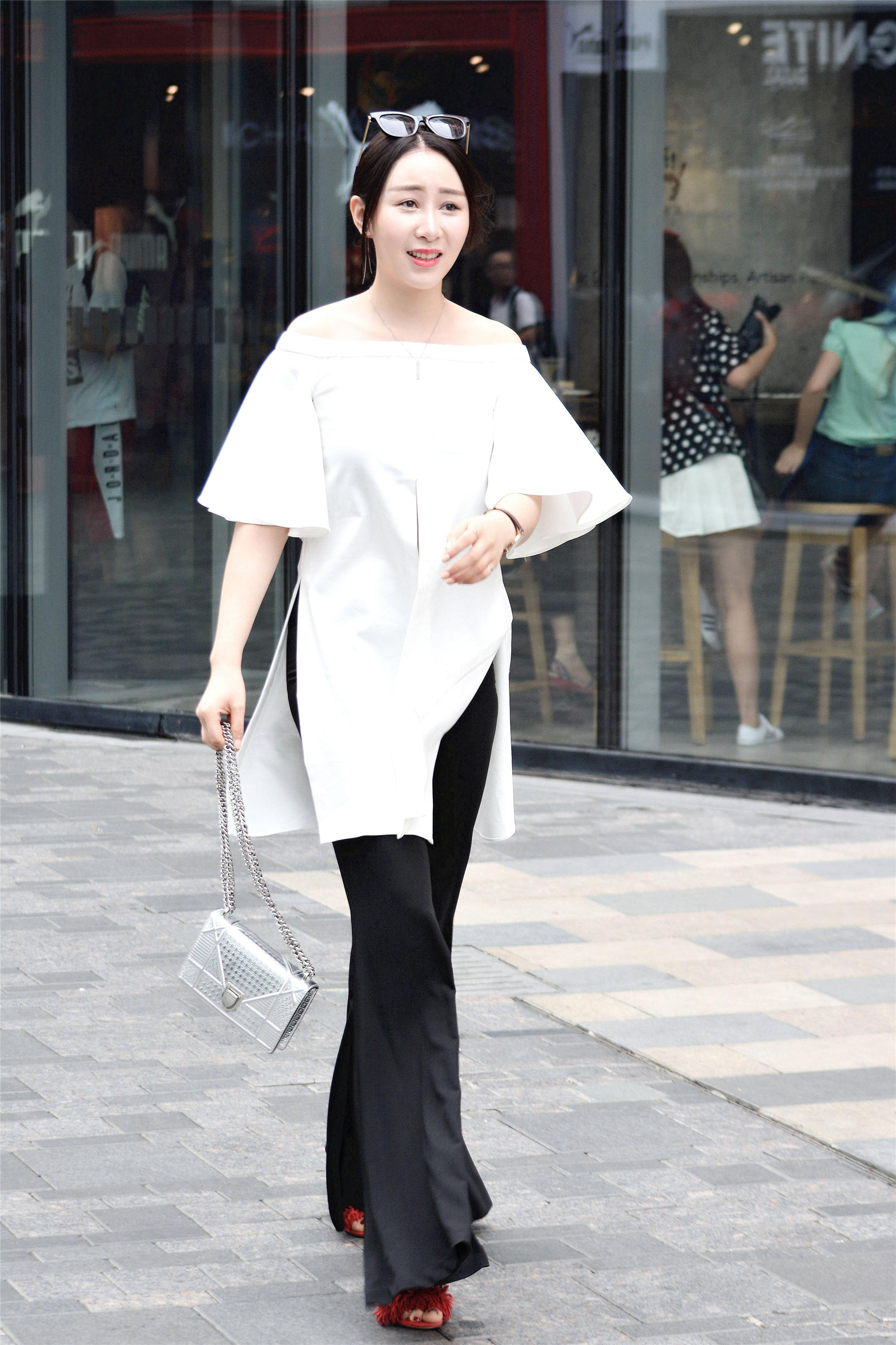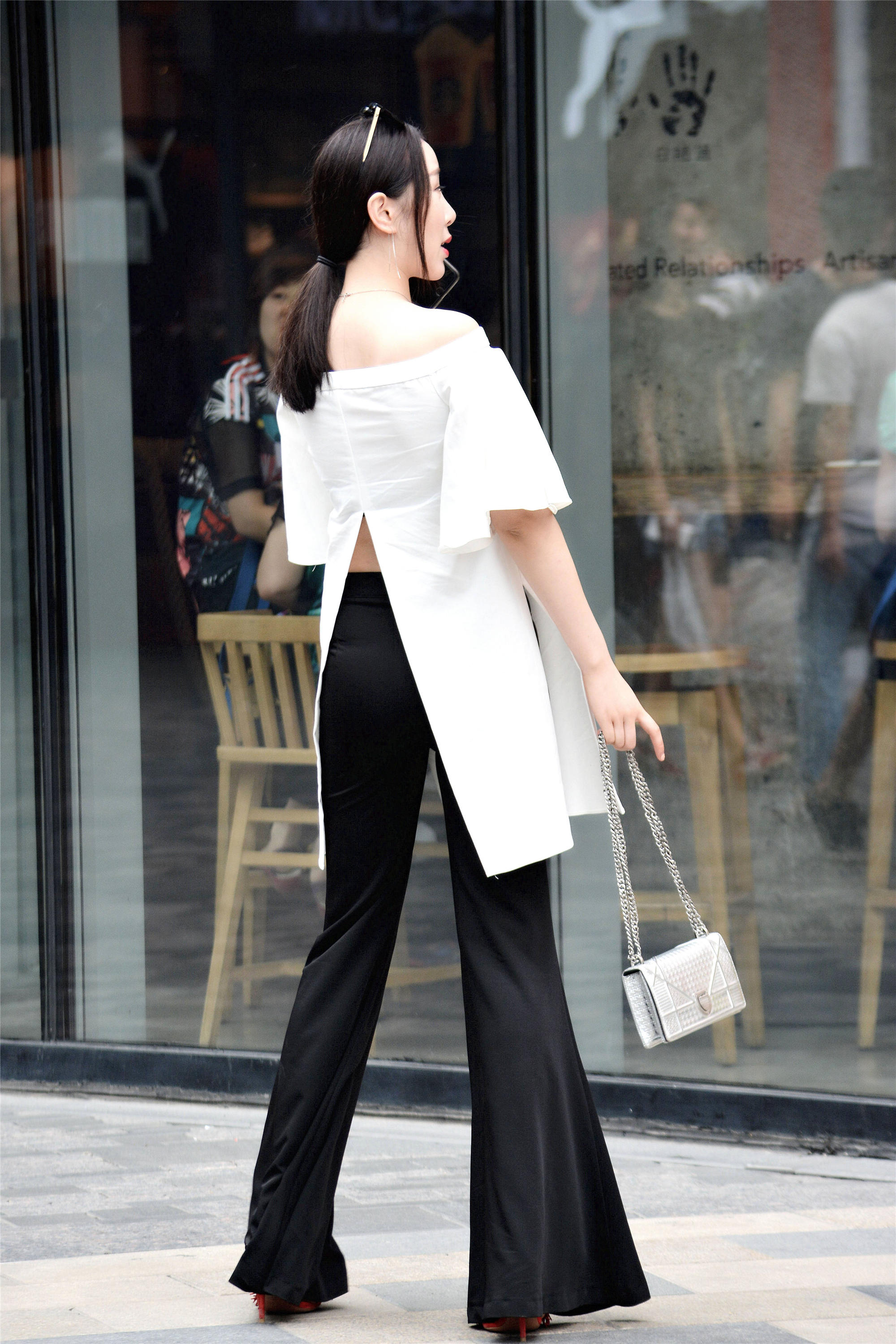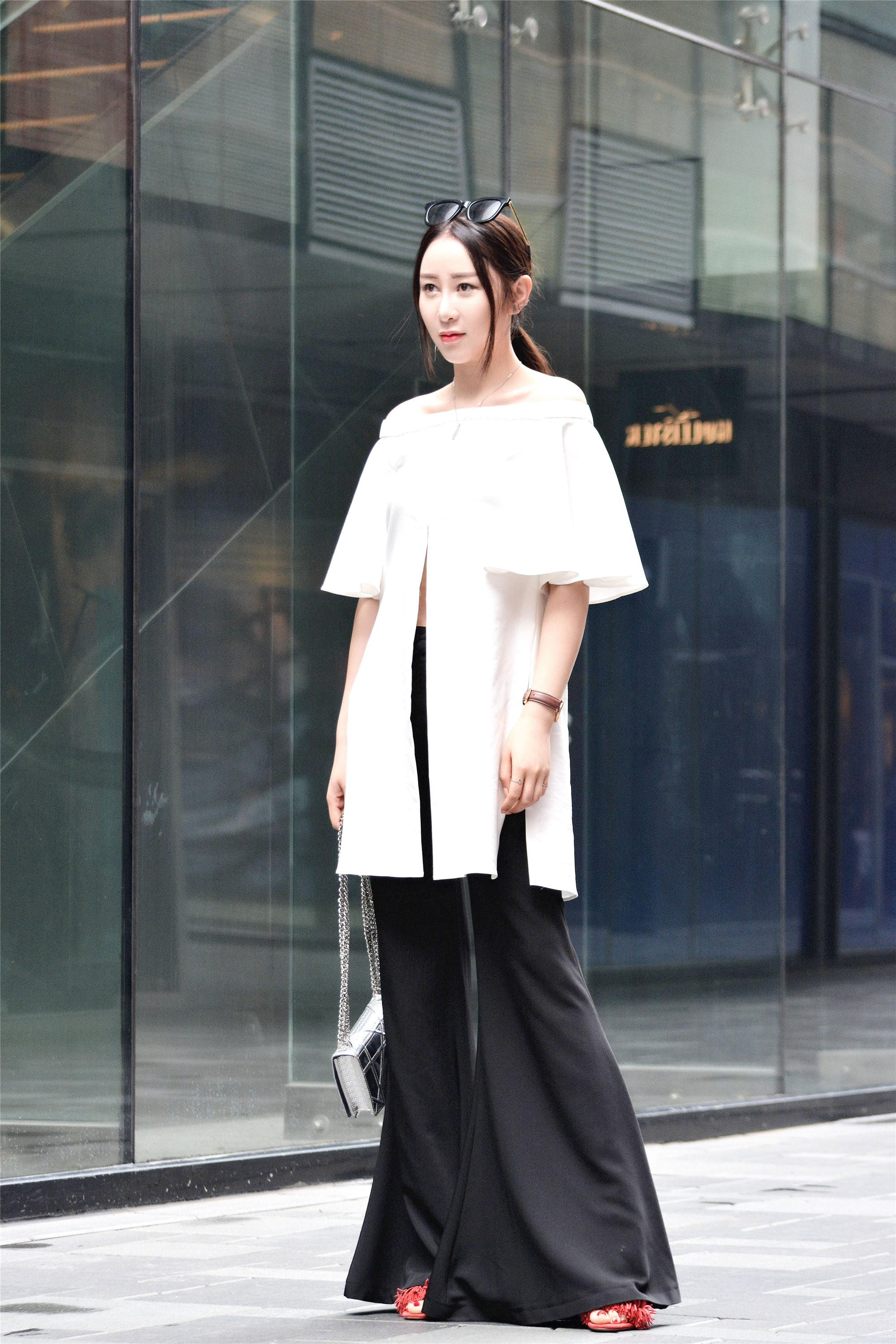 喇叭裤,是一款很好的裤子,而且也容易搭配出效果,不一定能够要选择牛仔喇叭裤,这位美女选择的这款喇叭裤,非常好看,黑色的高腰款式,简约大气,而且还不是很挑身材,很容易搭配出效果,一件白色一字肩,在四个方位都开叉处理,增加层次感,走起来也带着飘逸的效果,可以偶尔露出喇叭裤的裤腰,这样会显得非常个性一些。