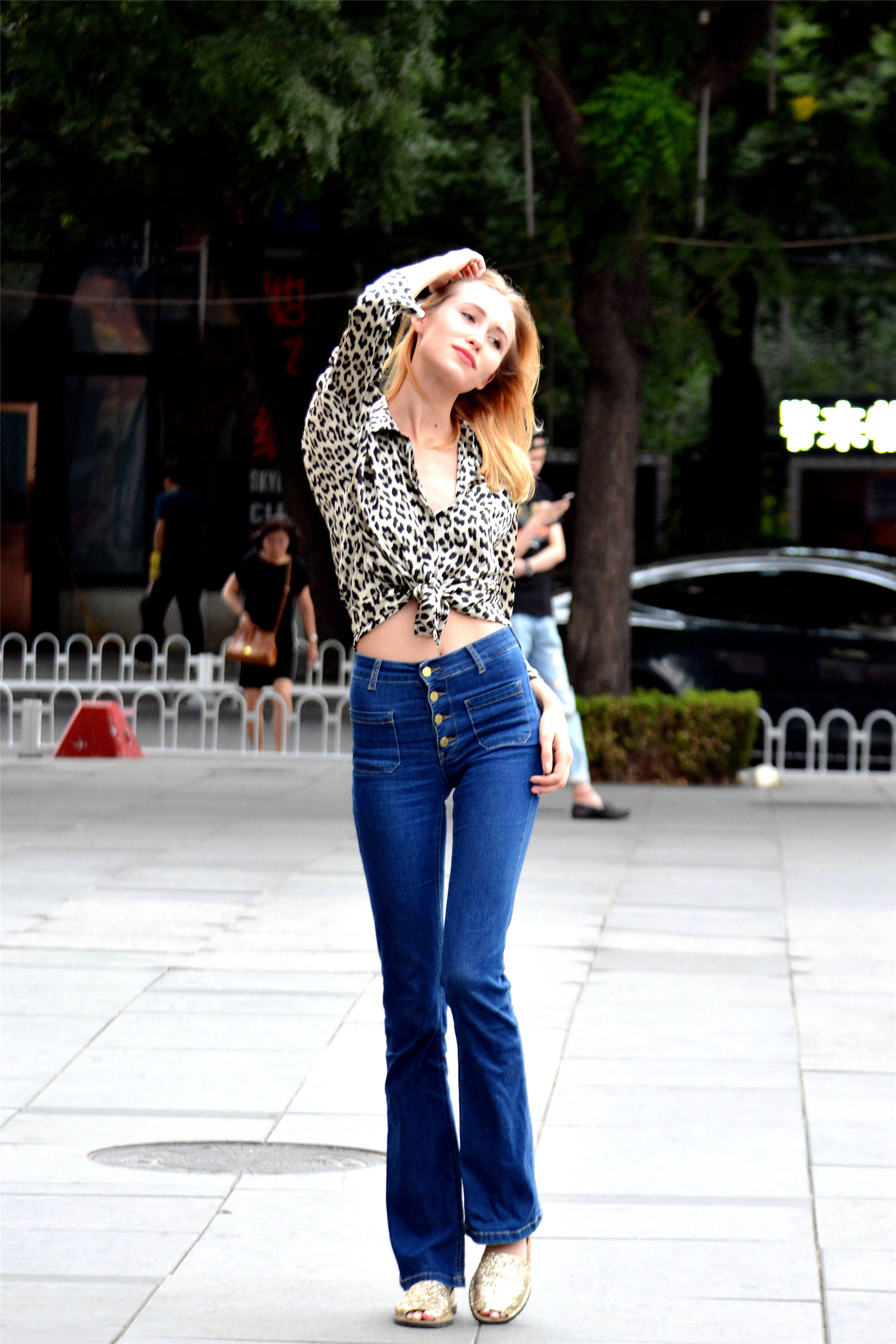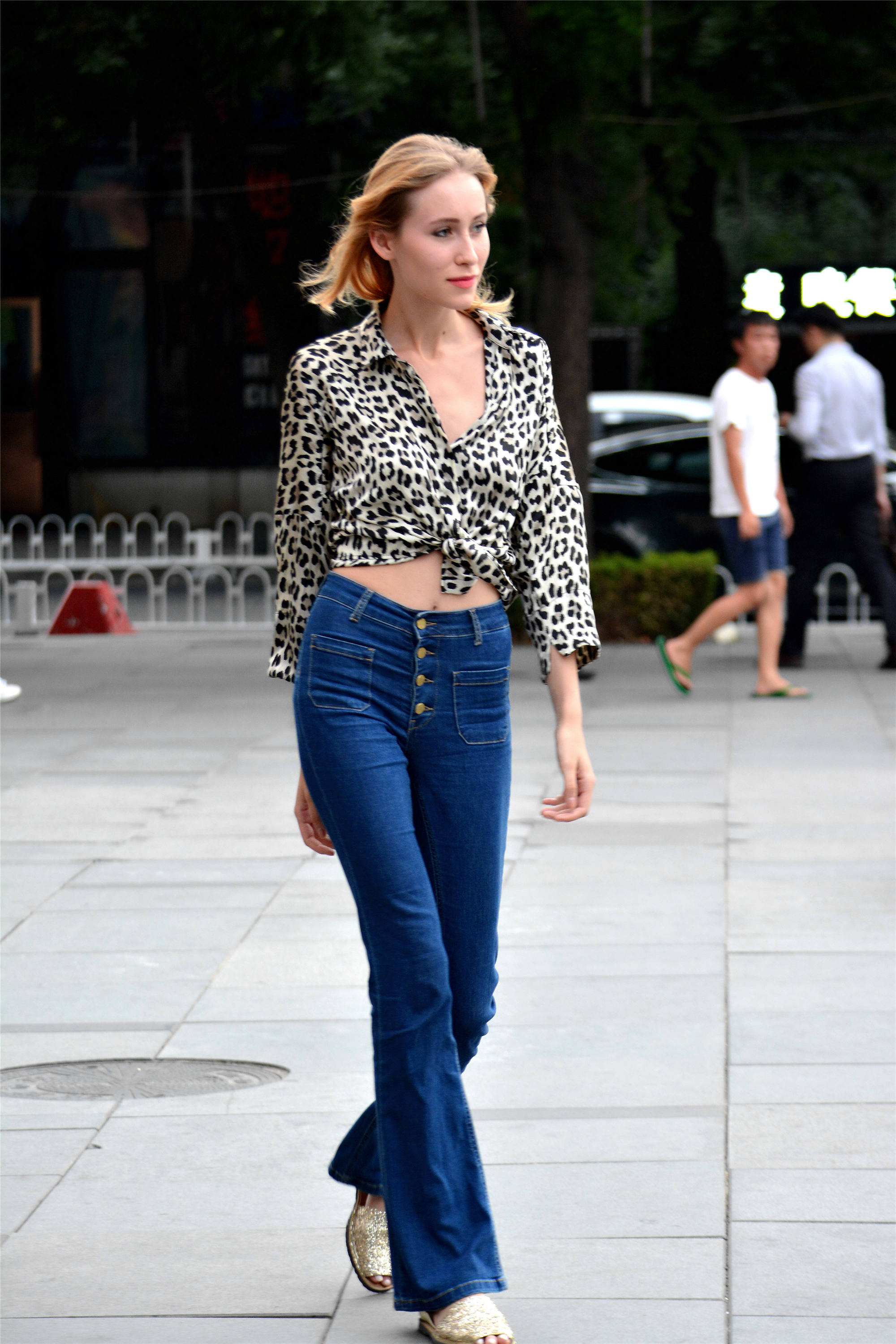 这样的牛仔裤,能够这么好的展现时尚姑娘的身材,和她的搭配技巧分不开,姑娘的上衣是一件豹纹的衬衫,姑娘衣襟系起来,更好展现牛仔裤的裤腰,也露出一点腹部,看起来就很美,把正式的衬衫,搭配出休闲的效果,领口的扣子没有系,这样就有了V领的效果,而且豹纹本身就有着很休闲,也带着一点野性的效果。